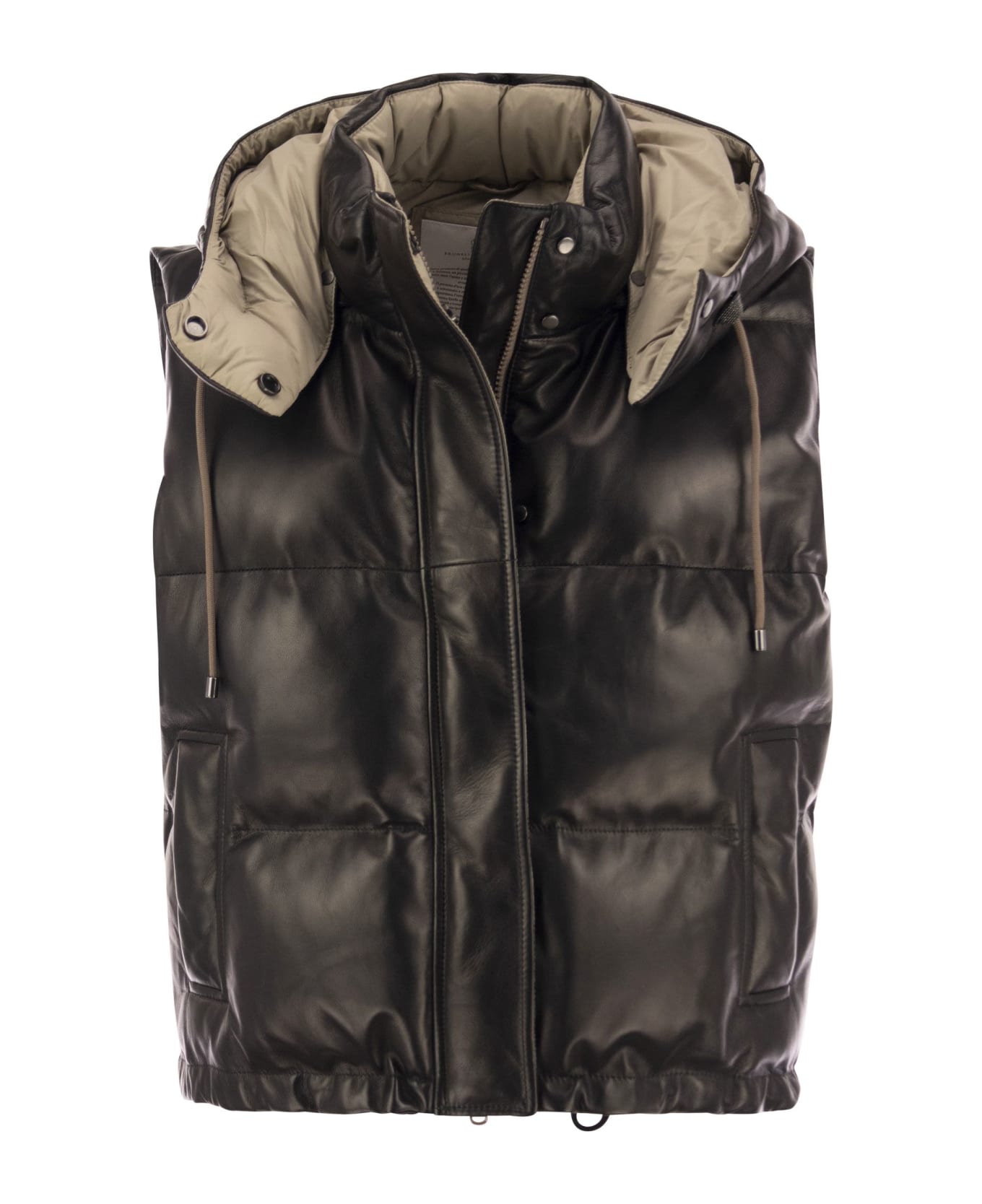 The genuine leather upholstery meets the sporty soul of the down jacket and is dressed in new refined effects. The sporty taste of the garment is enriched by the qualities of the leather, quilted like a down jacket. The soft, premium-quality padding completes the garment's versatile and refined style. - Zip and double-slider closure - Adjustable hood with drawstring - Drawstring at bottom - Low side pockets - Filling made of high-quality natural materials: 90% goose down, 10% down - Nickel-free decoration DESIGNER ID: MPNPI2659P C101