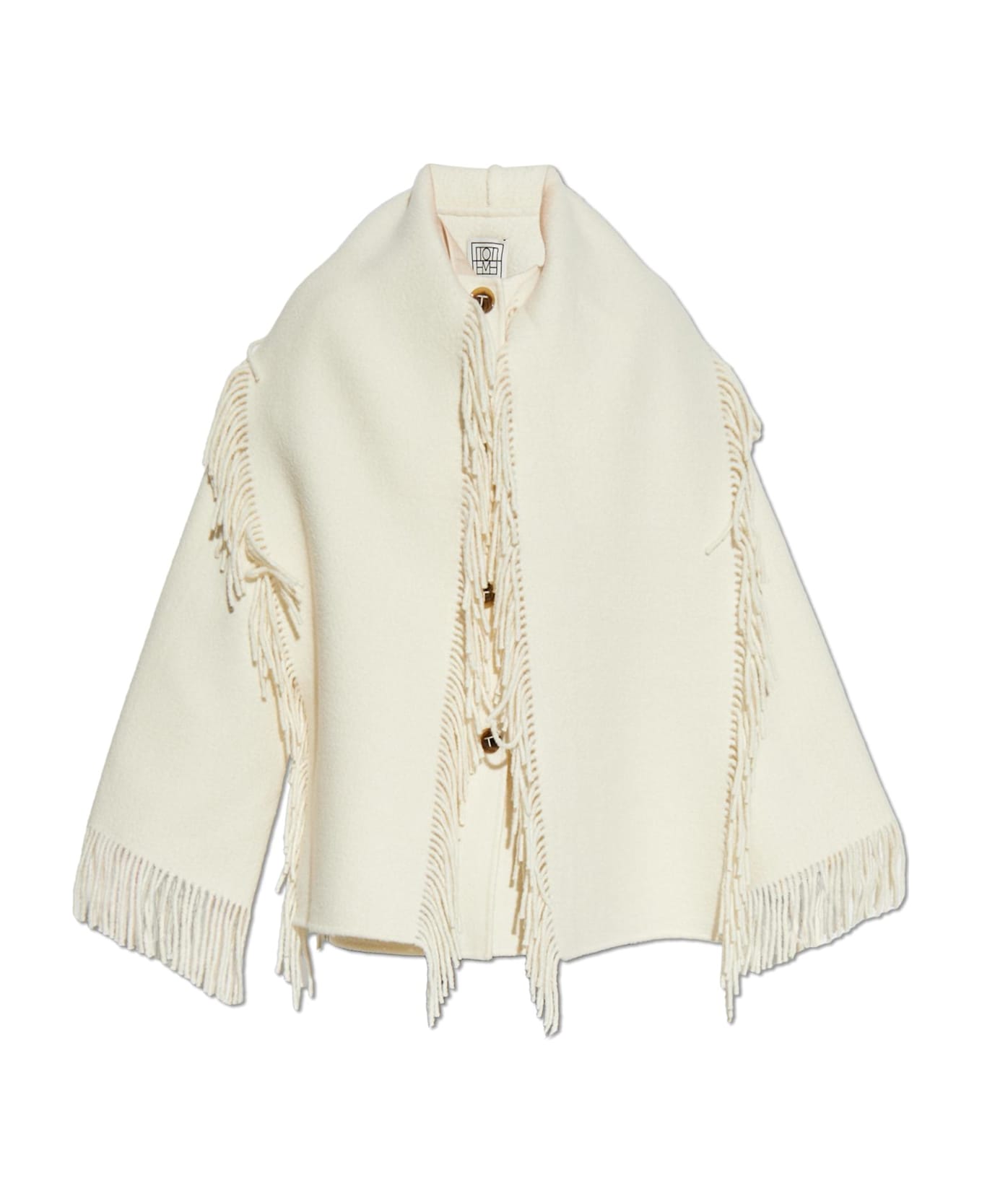 Discover the understated allure of the Wool Jacket with Scarf by TOTEME, where minimalist sophistication meets contemporary artistry. Crafted from luxuriously thick, finely woven wool, the jacket is rendered in an effortlessly relaxed silhouette with broad sleeves and a straight shoulder line providing both comfort and an air of refined elegance. Devoid of embellishing prints, this piece captivates with distinct fringed detailing along the edges of its sleeves, hem, and scarf-inspired collar, imparting a soft, artistic touch. The matte, gently softened fabric underscores its premium character, while oversized brown buttons lend a statement finish. Why choose this product? Finely woven, high-quality wool blend for exceptional warmth and comfort Striking fringe accents create a unique, modern aesthetic Minimalist design exudes sophisticated versatility Relaxed, oversized cut flatters a range of silhouettes Exclusive TOTEME creation, merging timeless luxury with progressive design