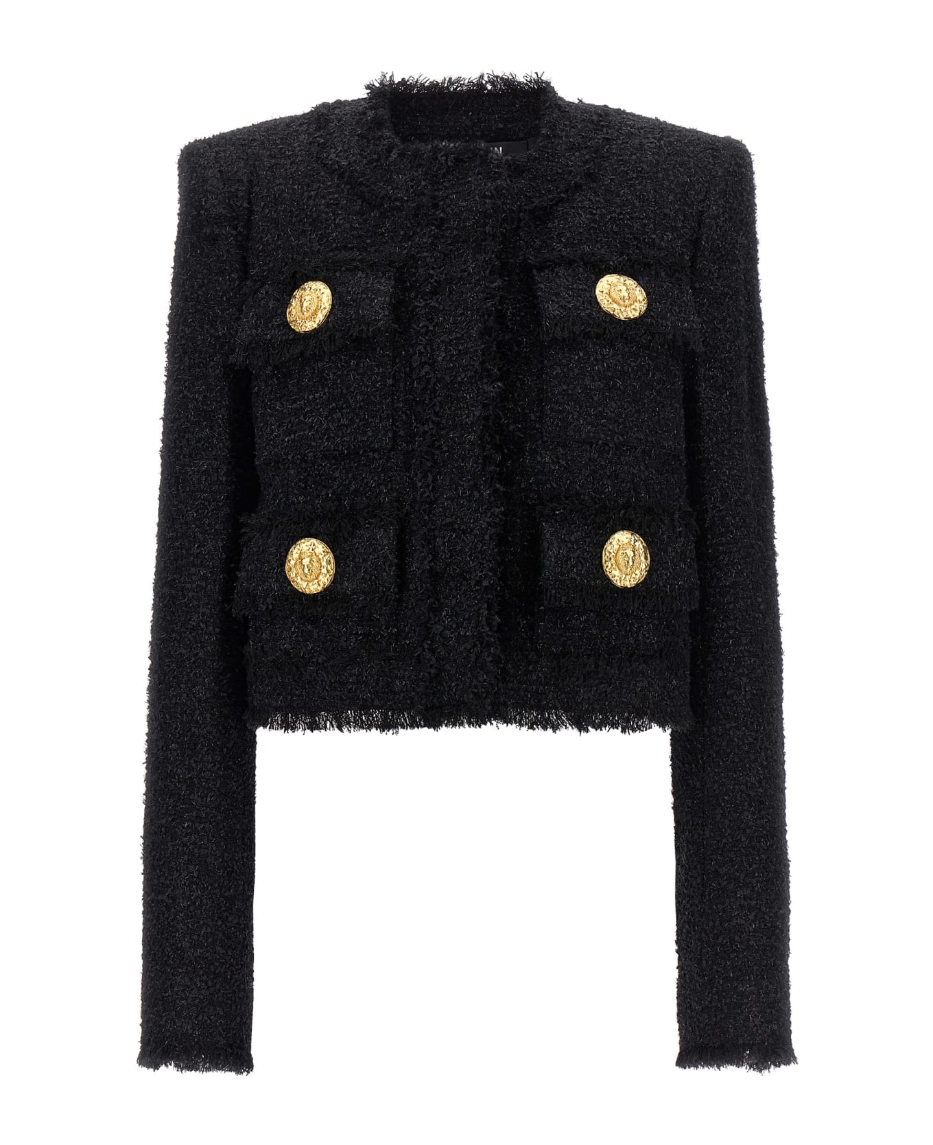 Short tweed jacket with button closure, pockets with gold metal buttons, long sleeves, and padded shoulders. Composition: 41% wo, 31% pa, 25% ac 3% pl