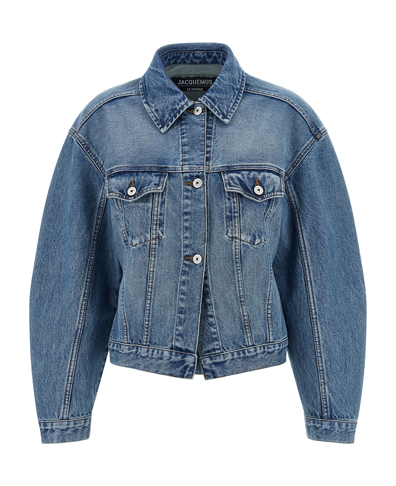 'La Veste De-Nimes' jacket in washed cotton denim with contrast stitching, logo embroidery and front button closure, shirt collar, pockets, long curved sleeves with cuffs and horizontal stitching, ruffles and adjustable belt at the back.
