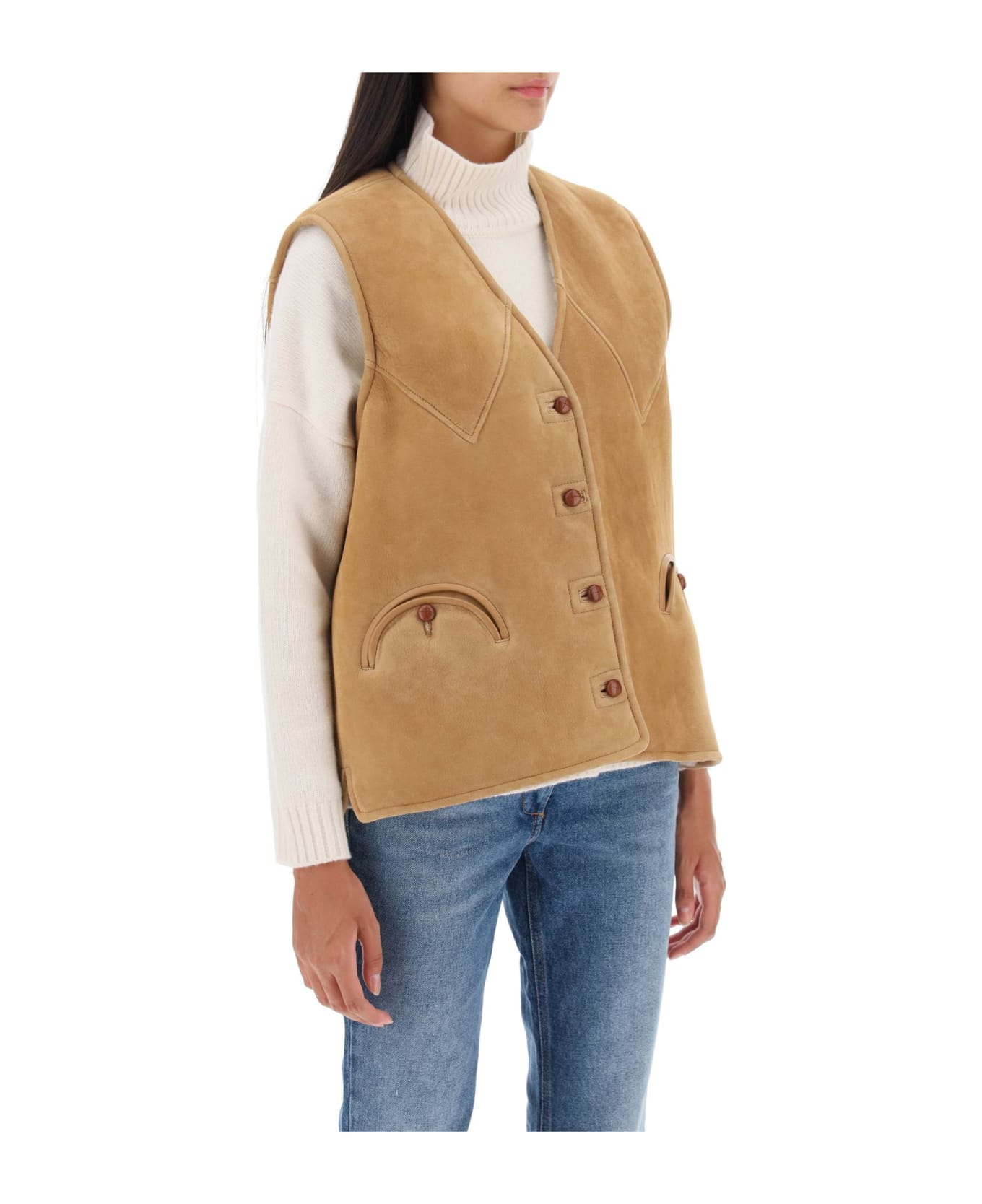 Blazé Milano vest crafted in sheep shearling. It features V neck, front fastening with loden buttons and signature Smiley pockets edged in tonal leather. Regular fit with straight cut enhanced by side slits. The model is 177 cm tall and wears size 1 Blazé Milano.
