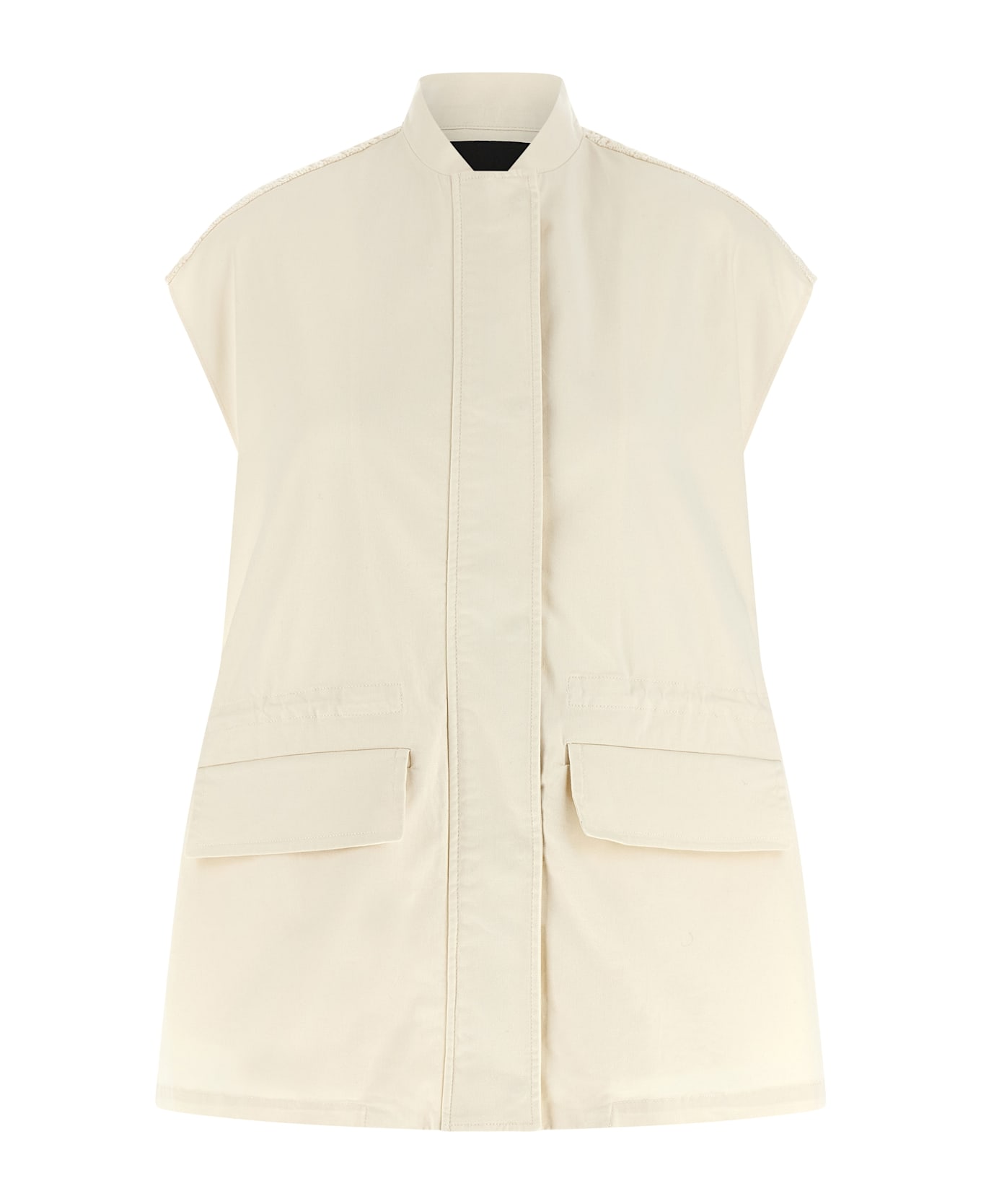 Cotton gabardine vest with tone-on-tone back crochet insert, high neck, zip and snap button closure on the front, pockets, and asymmetrical hem. Composition: 97% cotton, 3% elastane