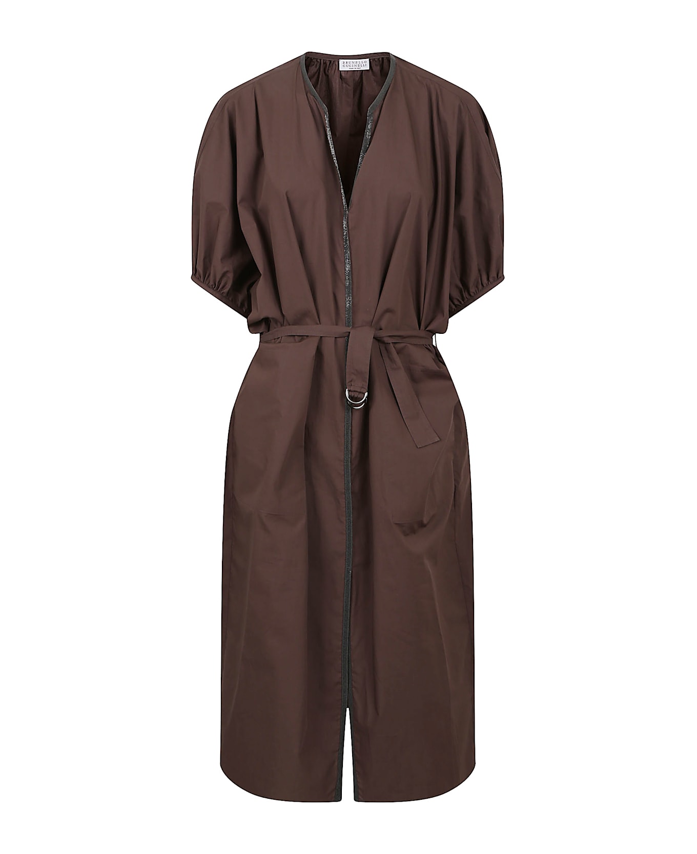 Cotton poplin dress by BRUNELLO CUCINELLI. Deep V-neckline; half sleeve with elastic that creates a balloon effect; belt at the waist. Featured with profiles enriched with monili embroidery.