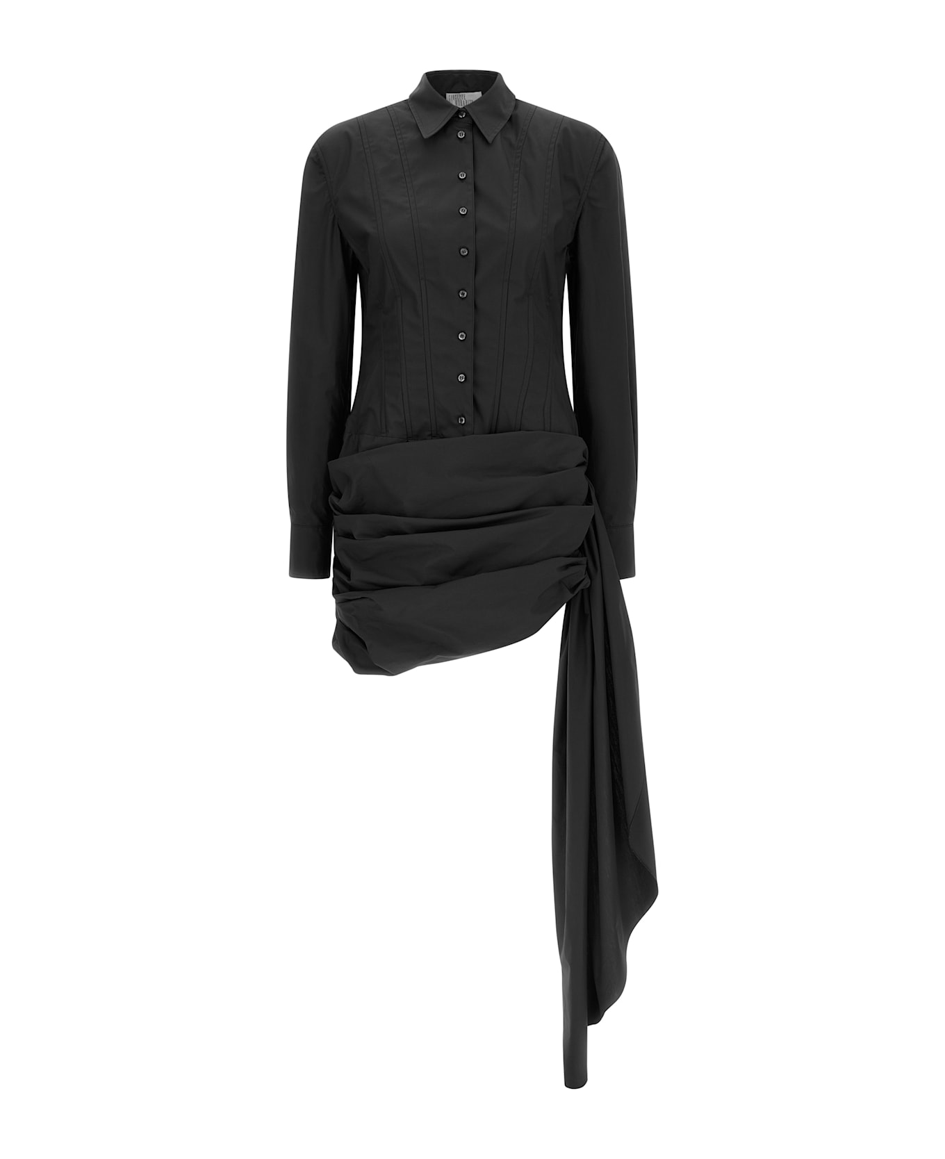 Mini dress in cotton poplin with chemisier model with bustier construction, front button closure, long sleeves with cuffs, skirt with curls, draping and side train.