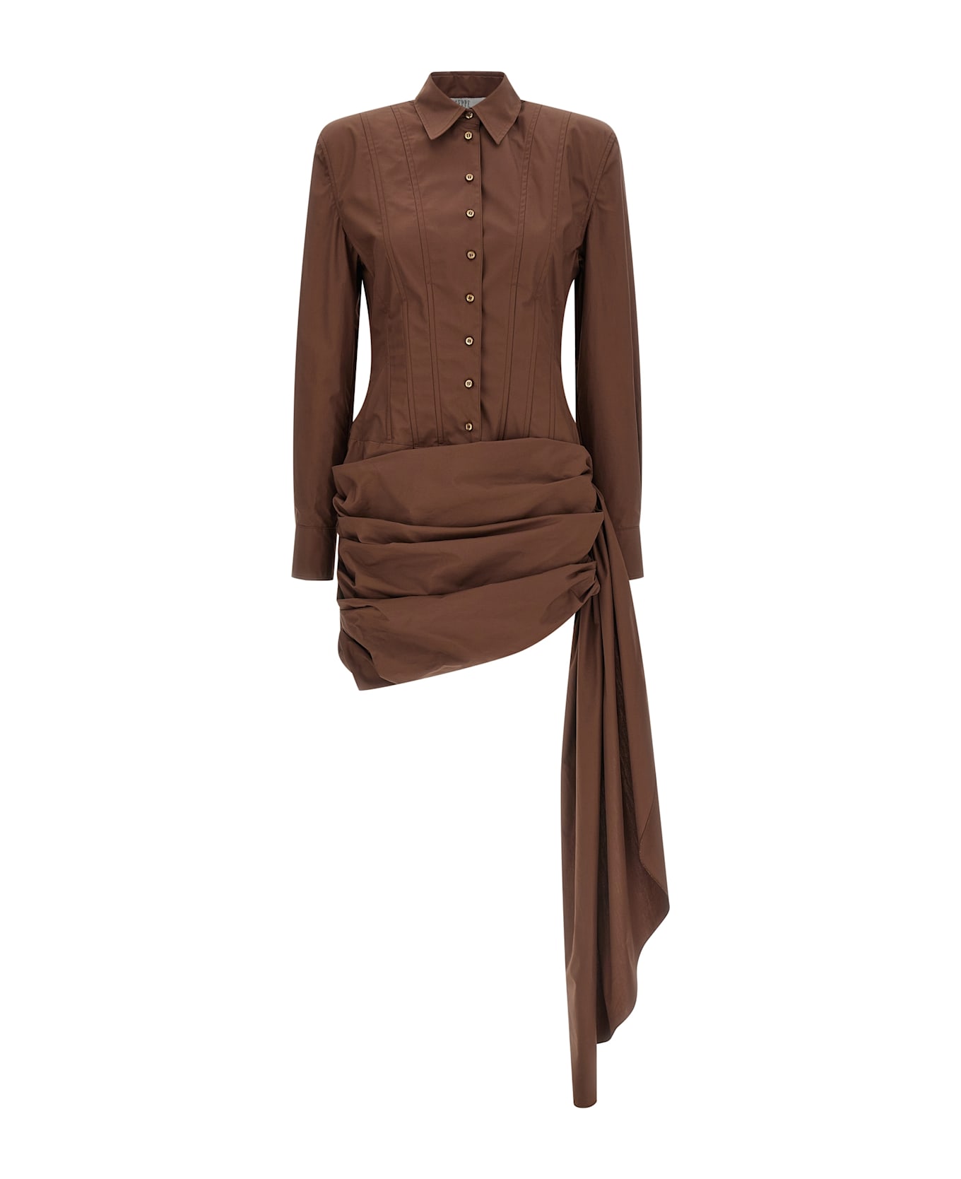 Mini dress in cotton poplin with chemisier model with bustier construction, front button closure, long sleeves with cuffs, skirt with curls, draping and side train. Composition: 100% cotton