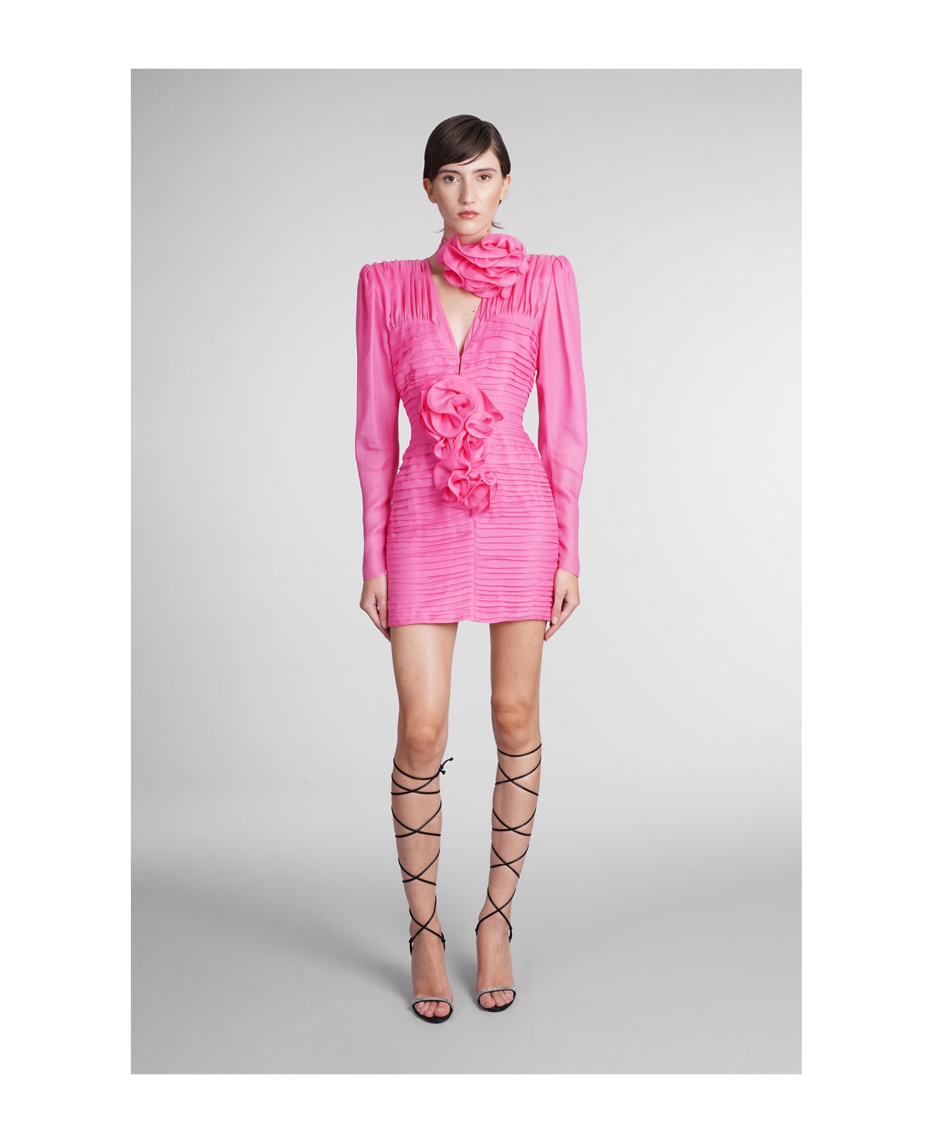 Dress in rose-pink silk, V neck, flower decoration, structured shoulders, pleated design, zip clousure, 100% silk, Model is 180 cm and wears 38, Made in Poland