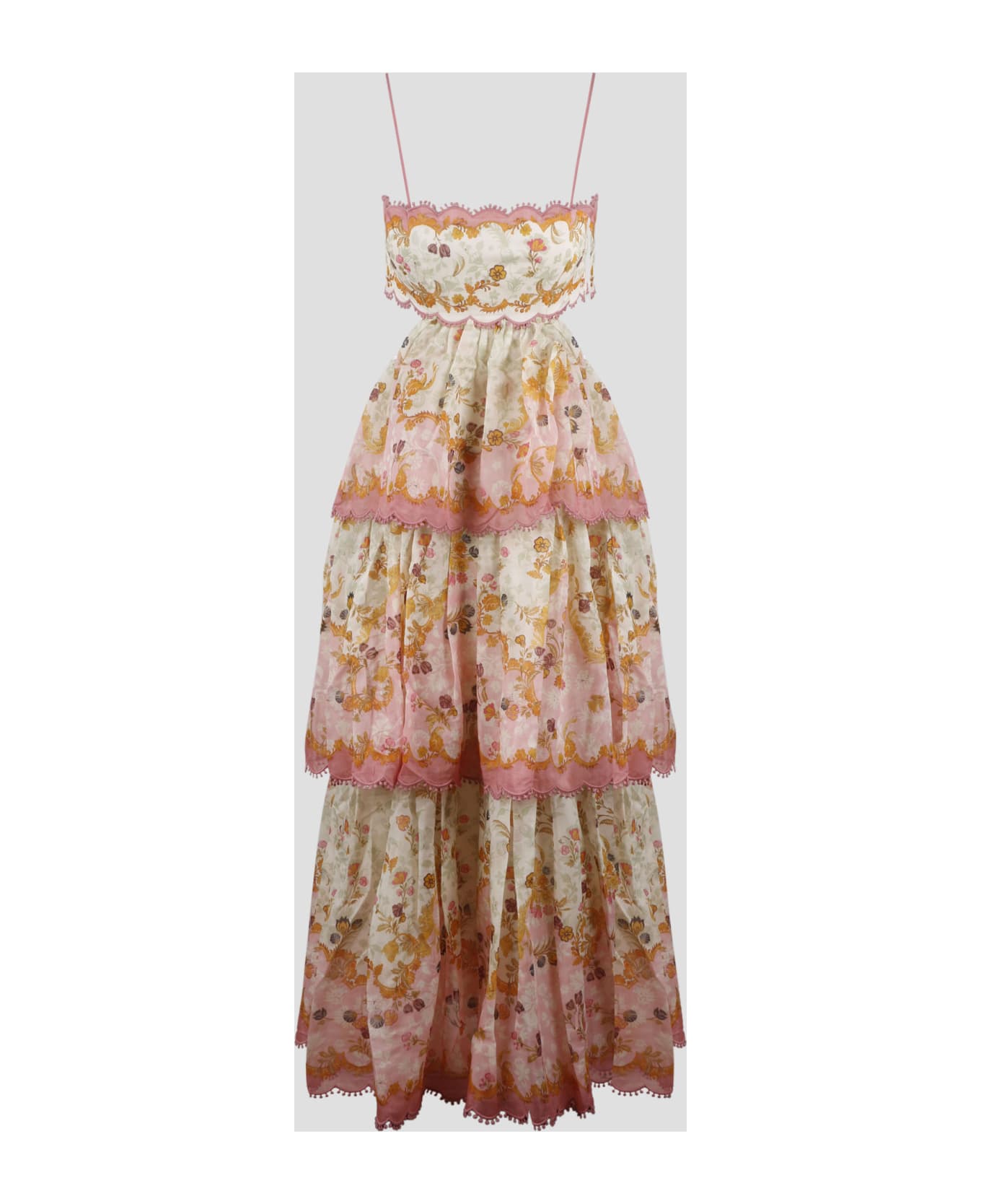 Zimmermann midi dress in printed floral cotton silk blend. - SS23 - Straight neckline - Scalloped tiers with lace trims - Adjustable thin straps - Cutaway waist - Invisible zip closure - Lace up back - Made in China - 70%Cotton 30%Silk