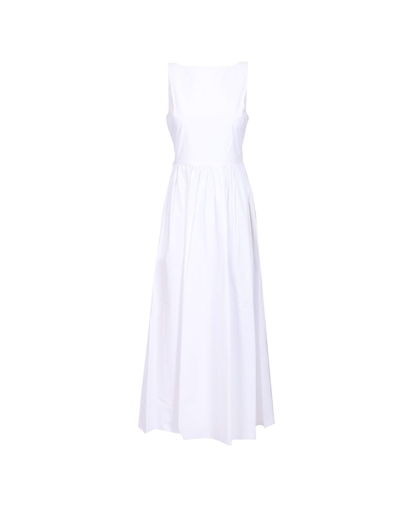 Matteau midi dress with a slightly gathered full skirt and a sleeveless bodice with a round neckline, featuring a low back and bow fastening.