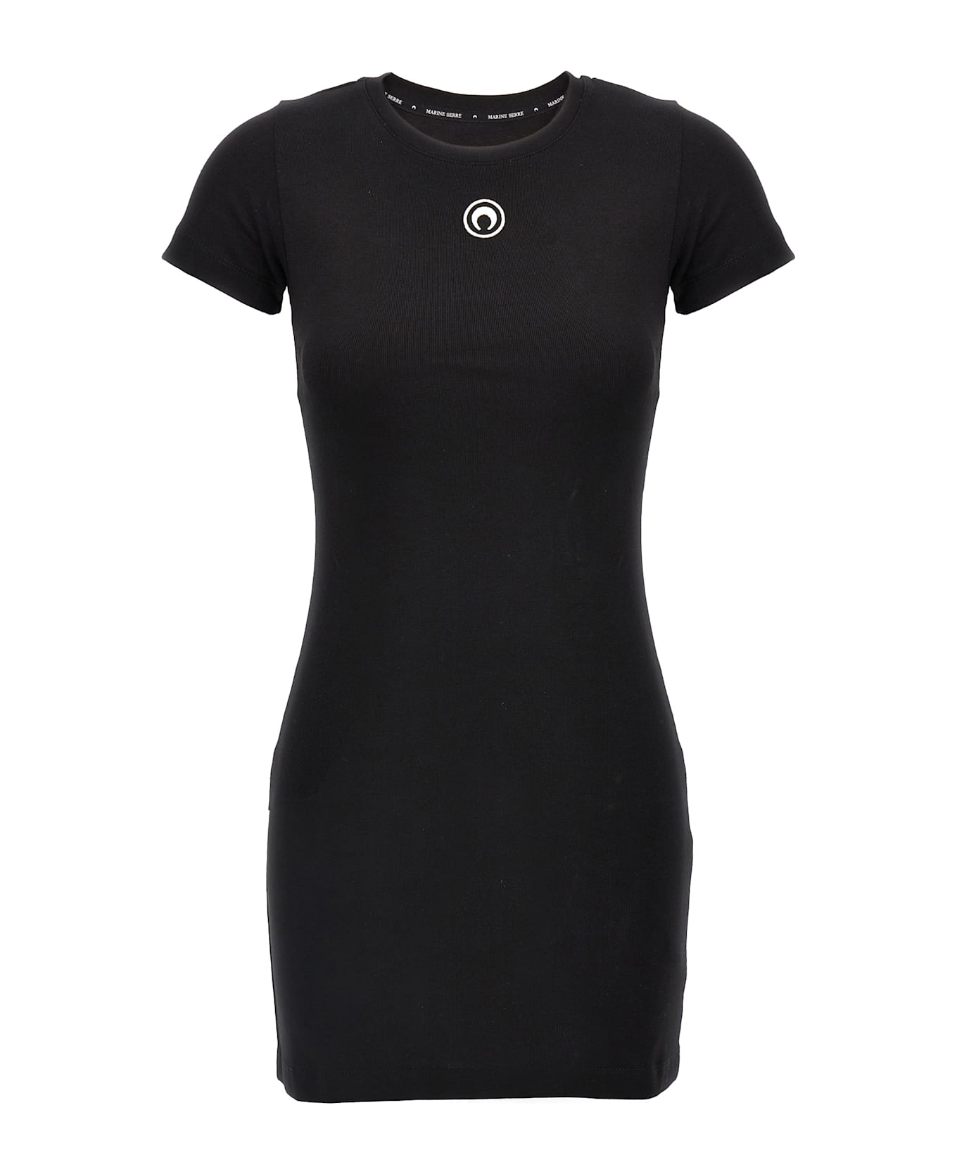 Cotton jersey mini dress with front 'Moon Logo' embroidery, back logo patch, crew neck, short sleeves.