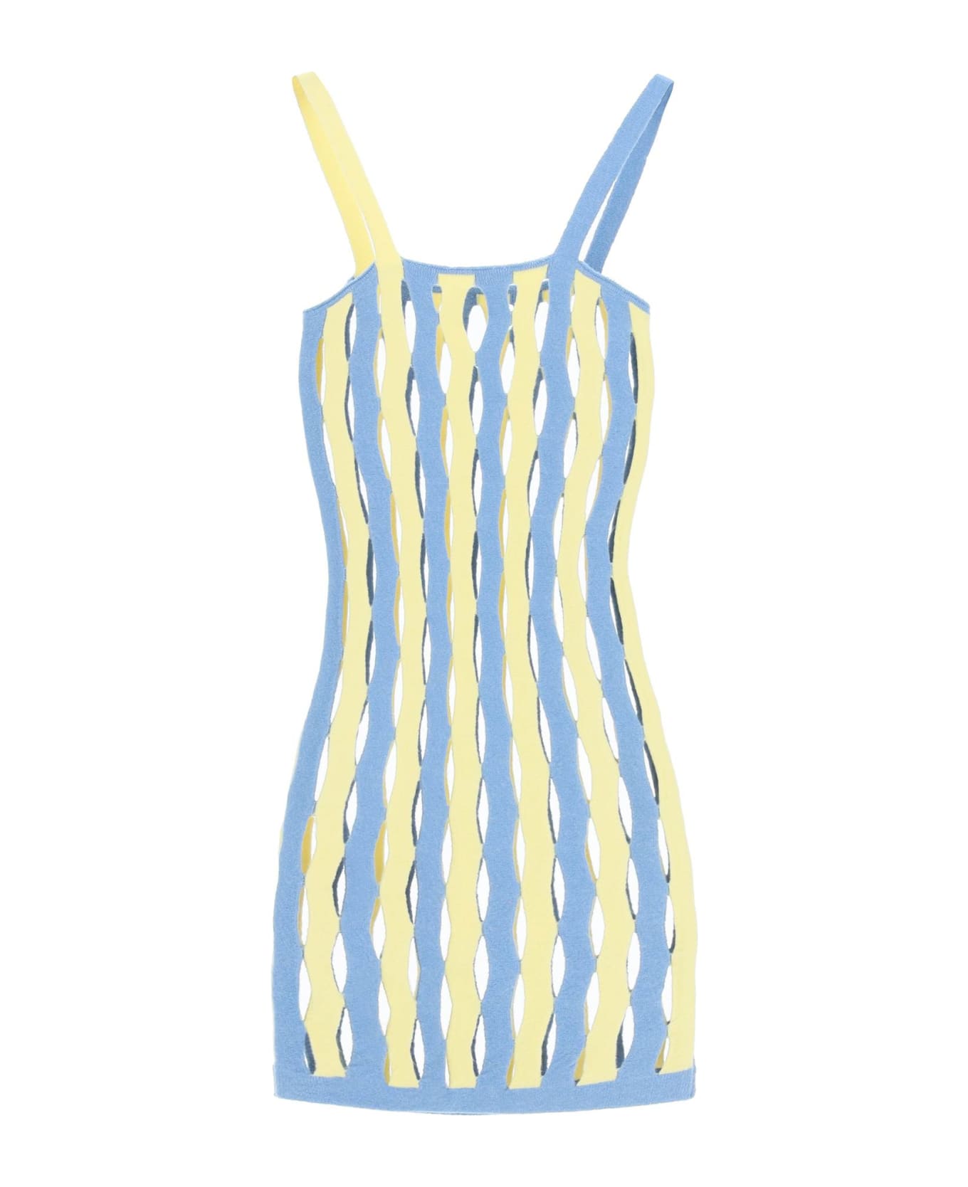 Form-fitting mini dress by Isa Boulder, handmade in stretch knit with net-effect cut-out pattern. Square neckline. The model is 177 cm tall and wears a size S.
