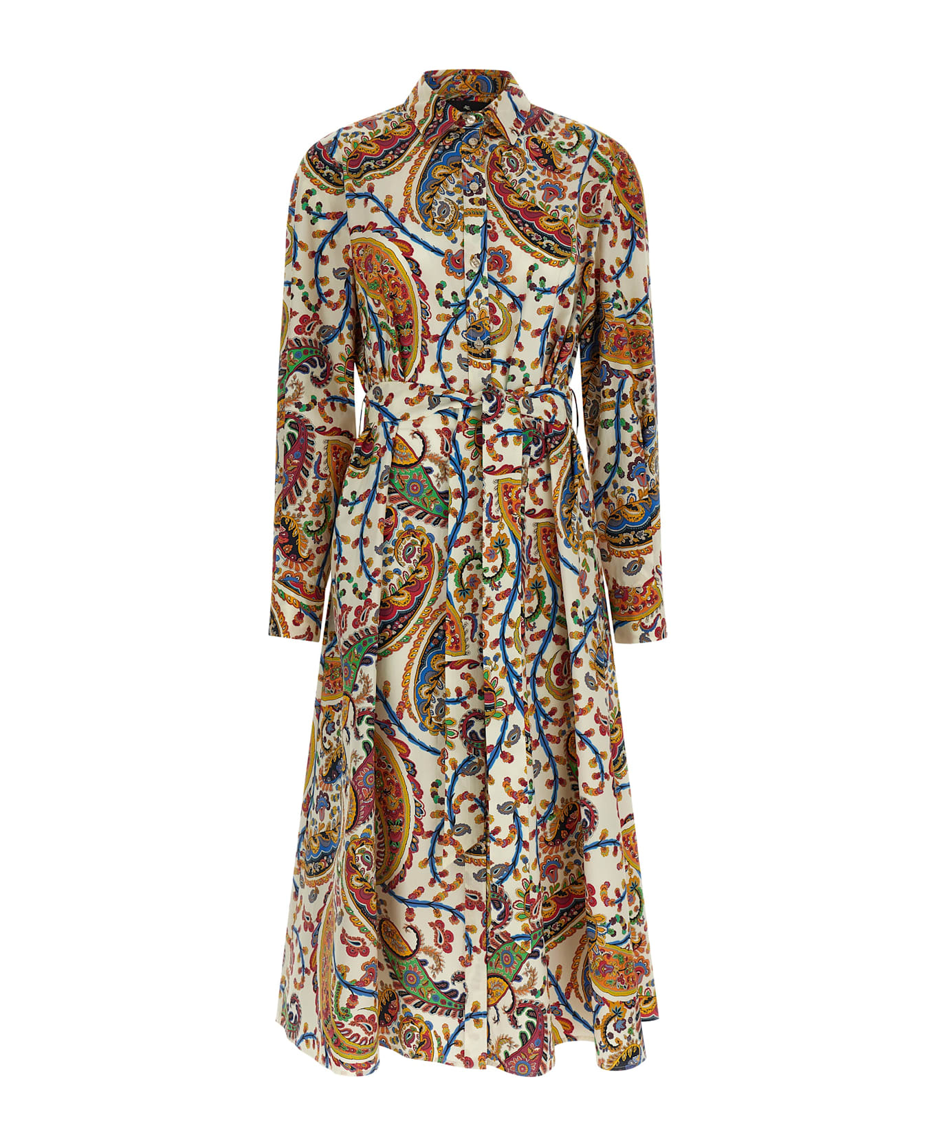 'Paisley Foliage' print cotton midi dress with chemisier style, flared silhouette, front button closure, pockets, long cuffed sleeves, removable belt. Composition: 100% cotton