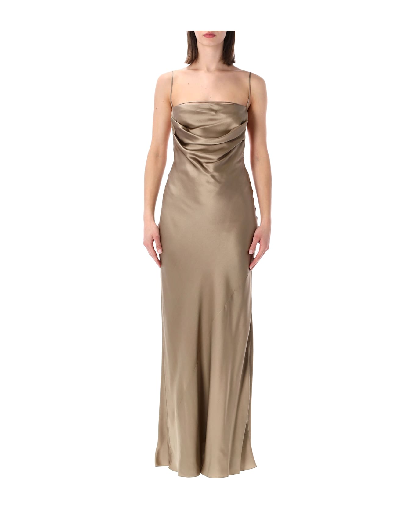 The Saint Laurent Backless Cowl Dress In Certified Silk Satin Offers Effortless Elegance For Formal Occasions. Featuring A Bias-cut Silhouette, A Draped Cowl Neckline, And An Open Back With Delicate Spaghetti Straps, This Long Dress Flows Gracefully While Enhancing The Natural Figure. The Silk Lining Ensures Luxurious Comfort And A Fluid Drape, Perfect For Evening Events Or Special Occasions. Made From Certified Silk Satin Bias-cut For Fluid Movement And Flattering Fit Draped Cowl Neckline Open Back With Spaghetti Straps Long, Elegant Silhouette Alessandra Is 1,75 M And Wears Size 36