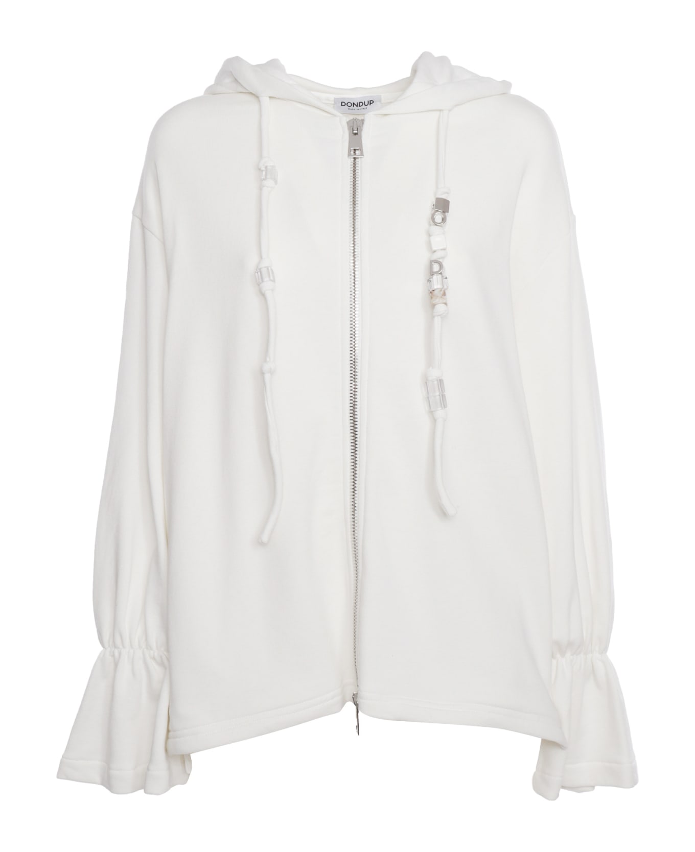 Brushed cotton sweatshirt, hood with jewel drawstring, zip fastening, puffed cuffs, fringes on the back