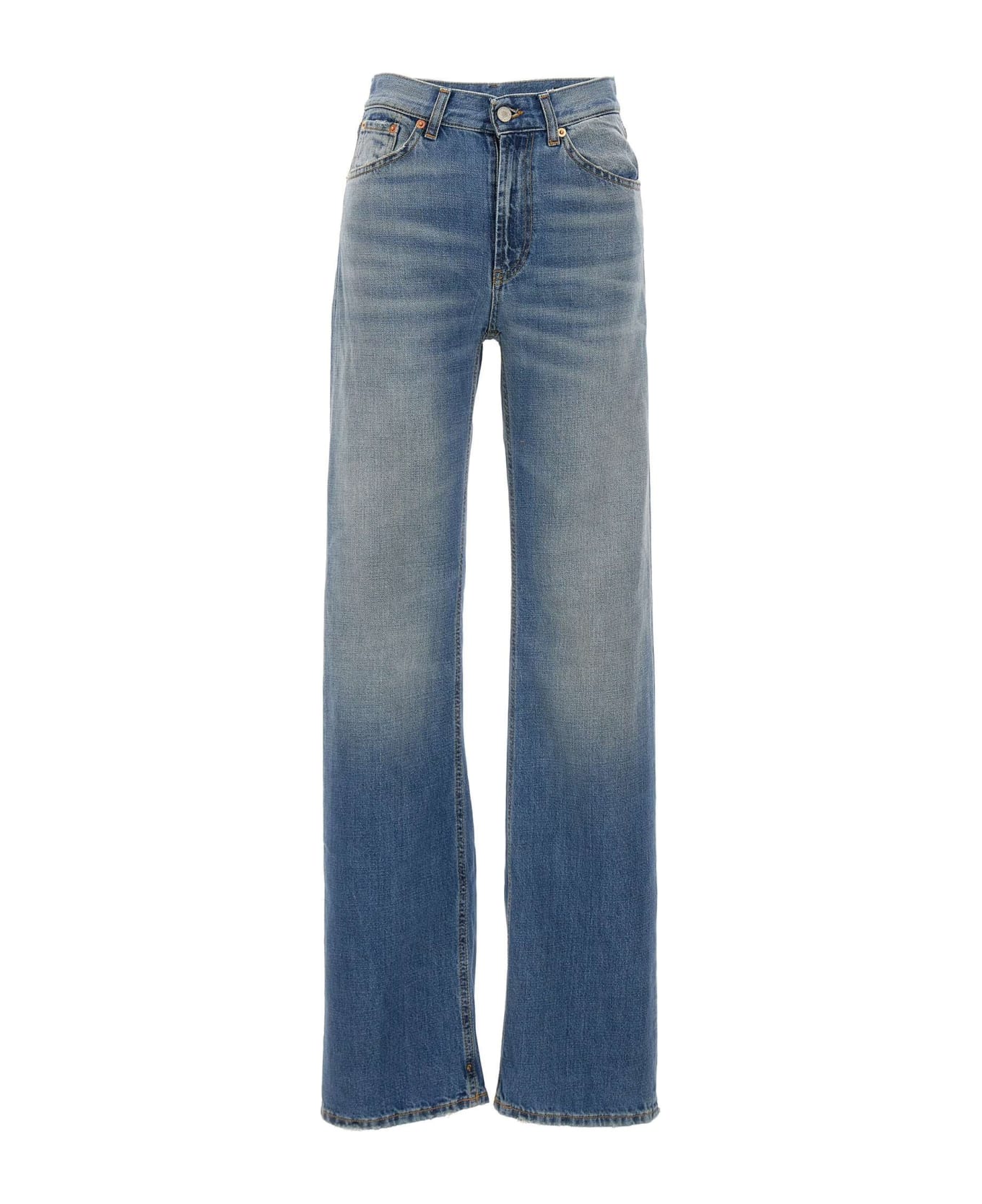 Dondup "Mabel" women's cotton jeans, light denim, five-pocket model, waist with belt loops. closure with logoed button and zip, wide leg fit, leather logo patch on back. Made in Italy.