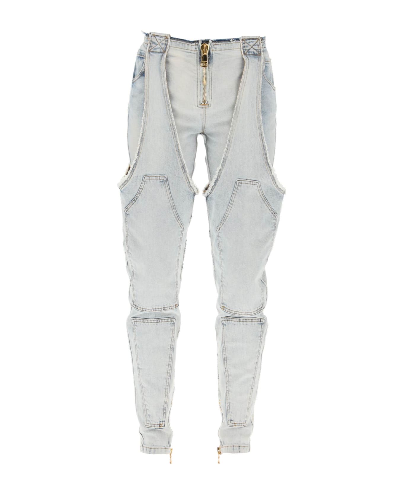 Balmain low-rise jeans in faded stratch denim, composed of a fitted five-pocket short enriched by garter-effect long gaiters with a tapered cut, looser on the thighs, finished with reinforcement panels and zip cuffs. They feature front closure with exposed zip, frayed trims and no waistband. The model is 177 cm tall and wears a size IT 40.