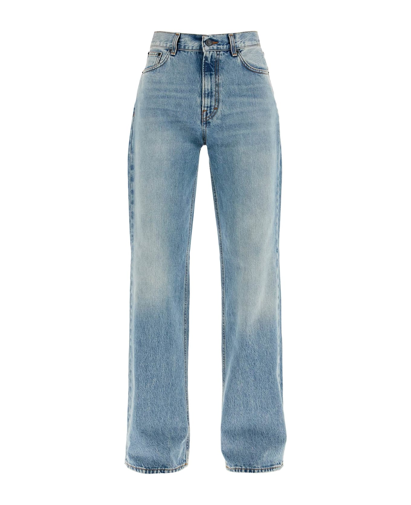 Haikure's Korea jeans are made from light vintage wash organic cotton denim, featuring a classic five-pocket design with a straight and regular high-waisted cut. They have a hidden zip and button closure, belt loops, and a branded jacron patch on the back waistband. The model is 177 cm tall and wears a size 26.