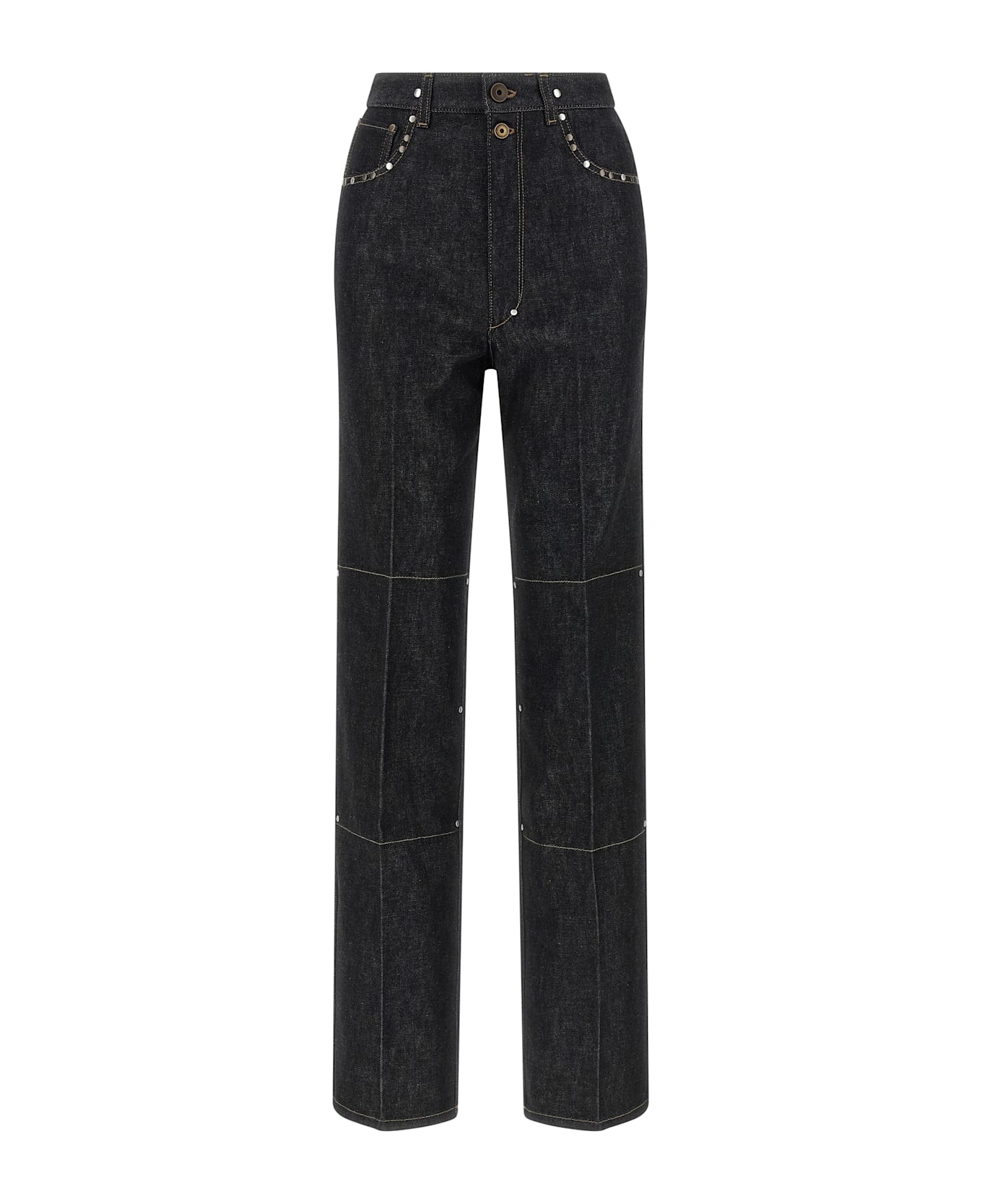 Heavy denim jeans with metal rivets of different sizes, contrast stitching, high waist, straight leg, stretched pleat, front zip and button closure, five pockets, leather logo label with embossed logo at the back.
