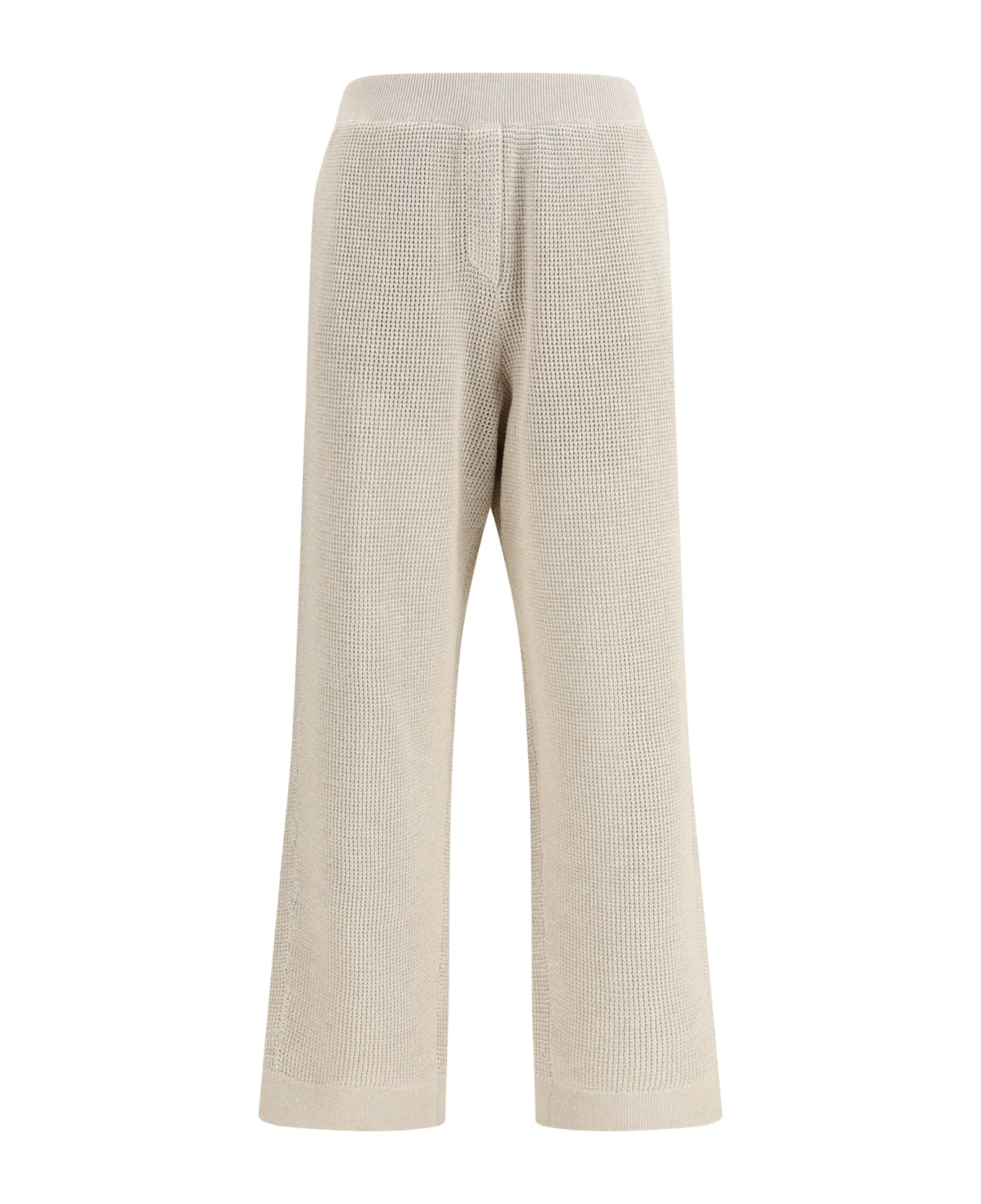 The straight-leg trousers by brunello cucinelli convey a refined sense of lightness through the perforated fabric construction enhanced by subtle lurex accents. the elasticated waistband ensures effortless comfort, while the clean silhouette balances relaxed elegance with material sophistication.