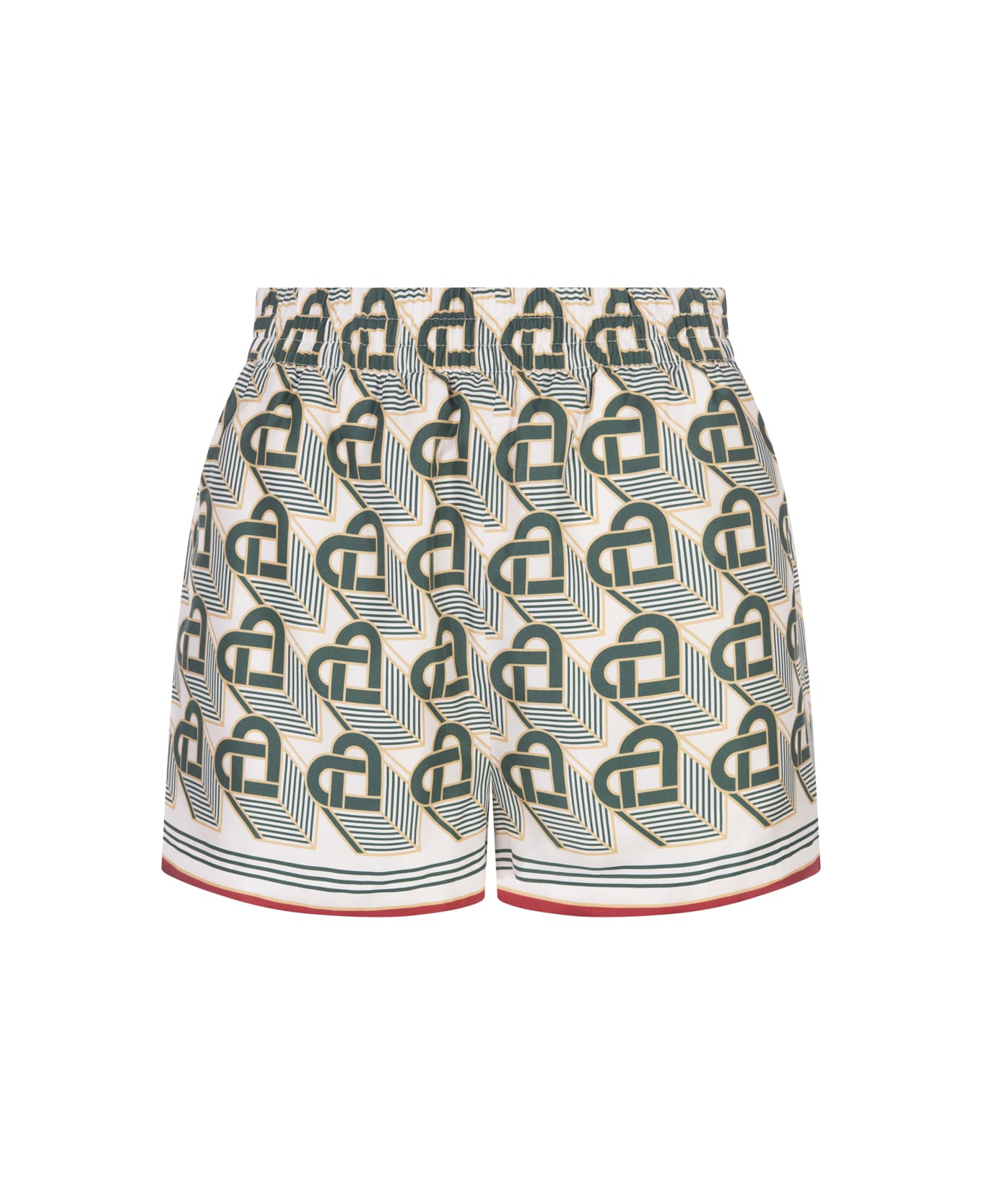 Casablanca shorts made of silk twill with all-over green Heart Monogram print. Finished with an elastic waistband, drawstring fastening and side and back pockets. Fits true to size, take your usual size. Composition: 100% Silk