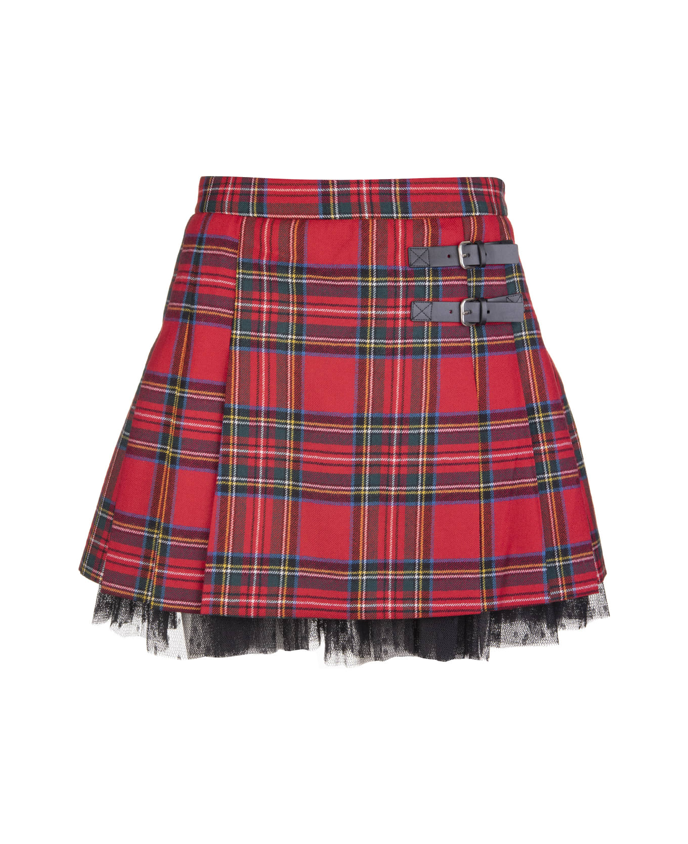 REDValentino pleated kilt mini skirt made of red woolwith tartan motif, underskirt in point d'esprit tulle and buckle detail at the waist. Length in size 40: 44 cm. Regular fit. Composition: 100% Virgin Wool