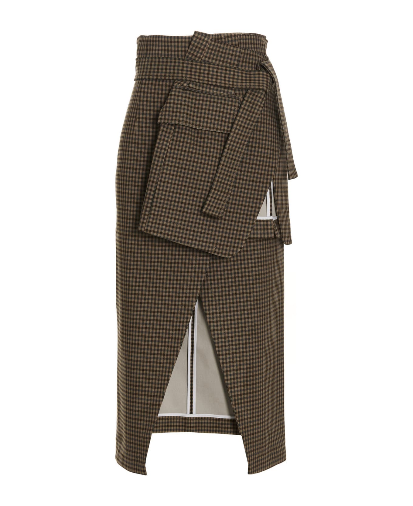Gingham print fabric wallet skirt with layered design, unstructured, belt at the waist and front flap pockets.