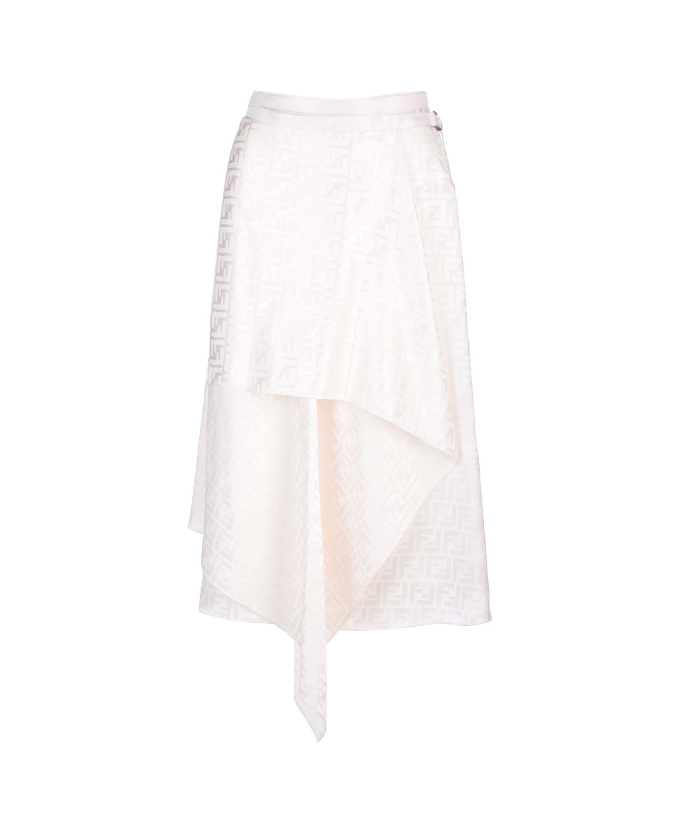 'FF' skirt from Fendi in white silk with all-over jacquard FF motif, high waist, slightly flared line, wraparound closure with long logoed ribbon and metal rings, front drape. Composition: CX3016 100%SE