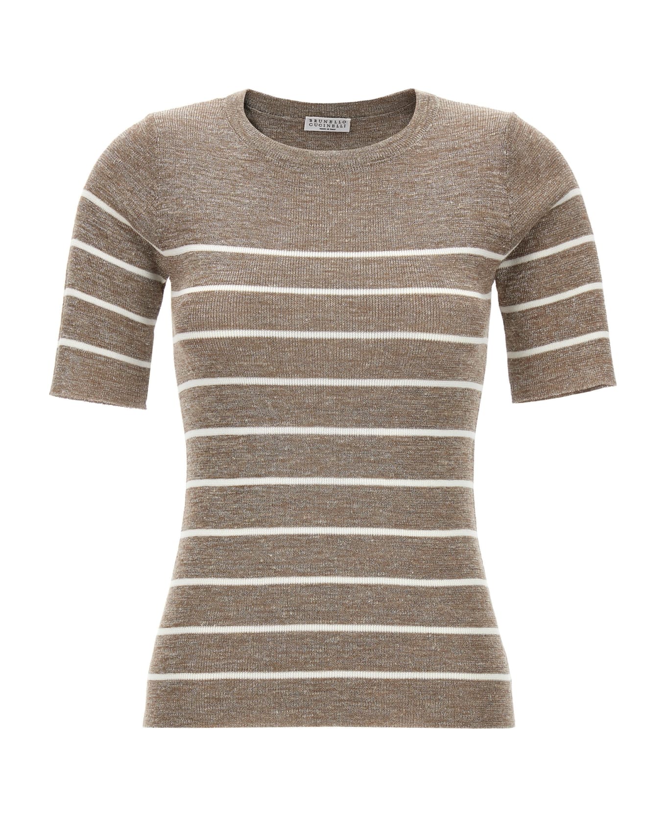 Striped linen and lurex blend sweater, with crewneck, and short sleeves. Composition: 45% linen 37% polyester 10% metal 8% polyamide