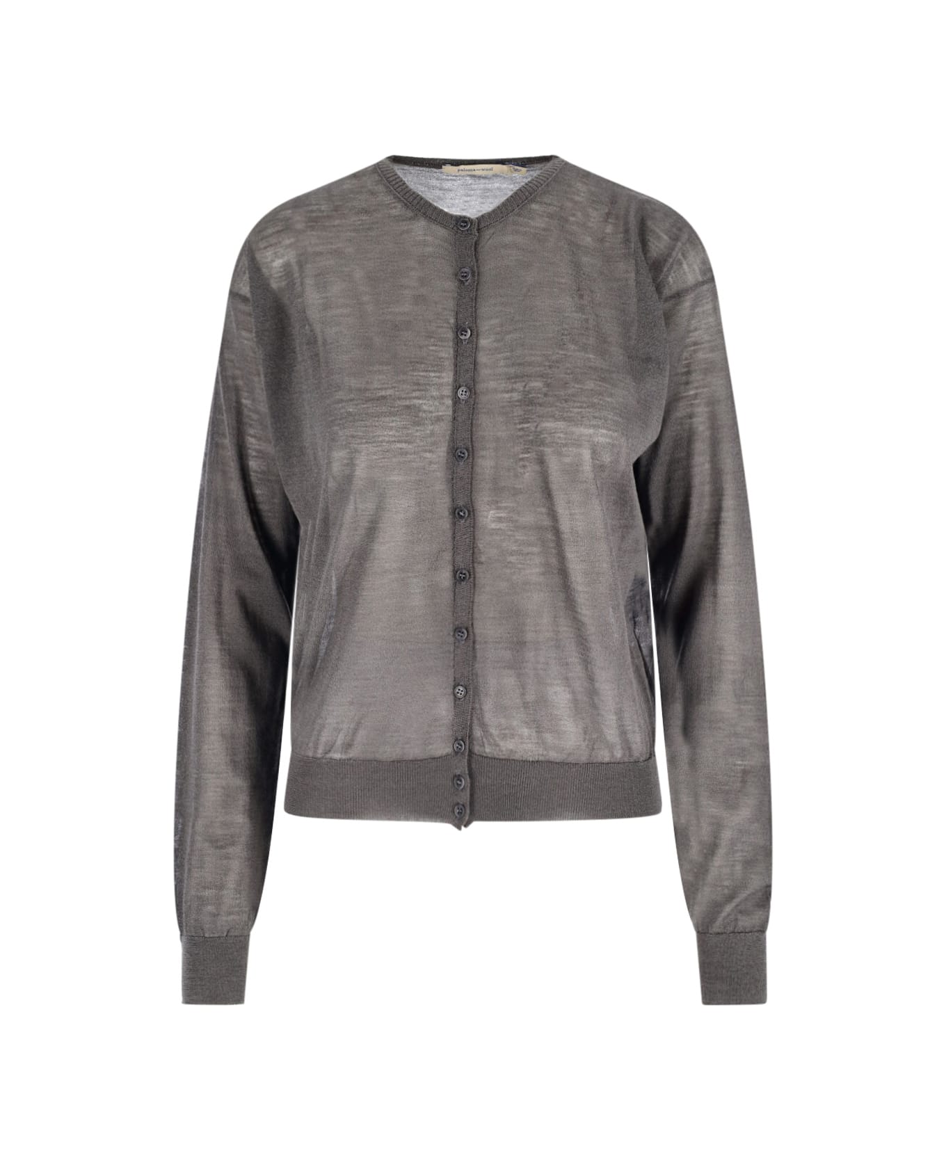 Paloma wool brown merino wool cardigan with round neckline, dropped shoulders, button closure, ribbed trims, straight hem.