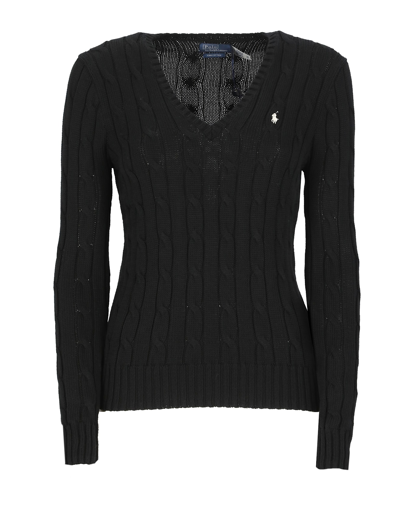 - Black Ralph Lauren cotton sweater for woman - V neck - Long sleeves - Front contrasting color iconic Pony logo - All-over braided pattern