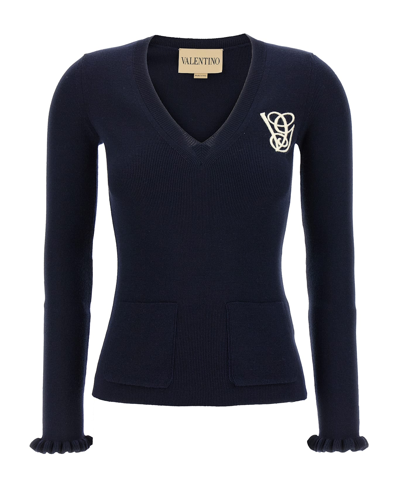 Valentino Garavani wool sweater with dense weave, front logo embroidery, V-neck, front pockets, long sleeves with ruffles on the cuffs. Composition: 100% virgin wool