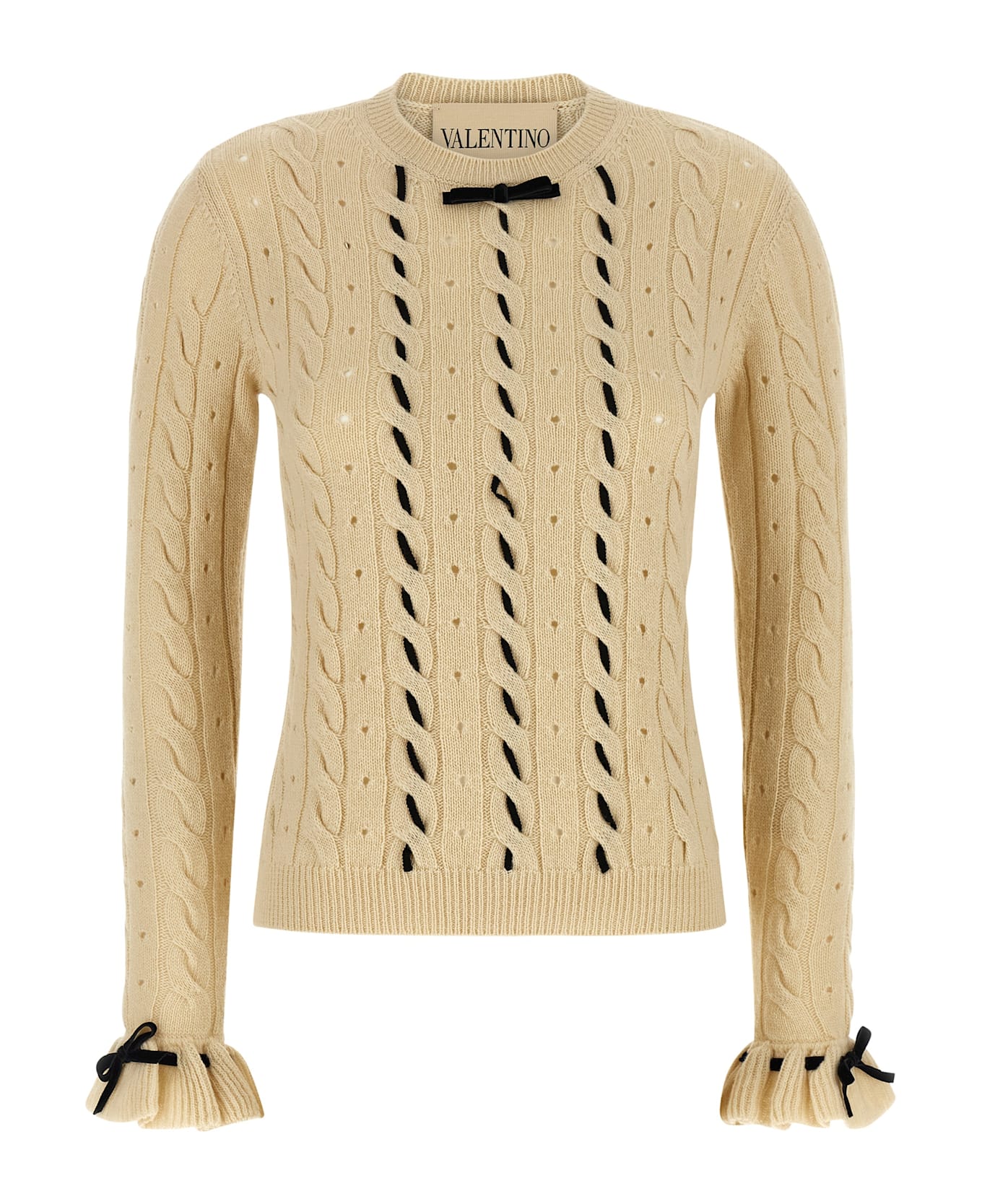 Braided wool sweater with velvet bow crewneck, grosgrain ribbon details, long sleeves with bow on the cuffs. Composition: 100% virgin wool