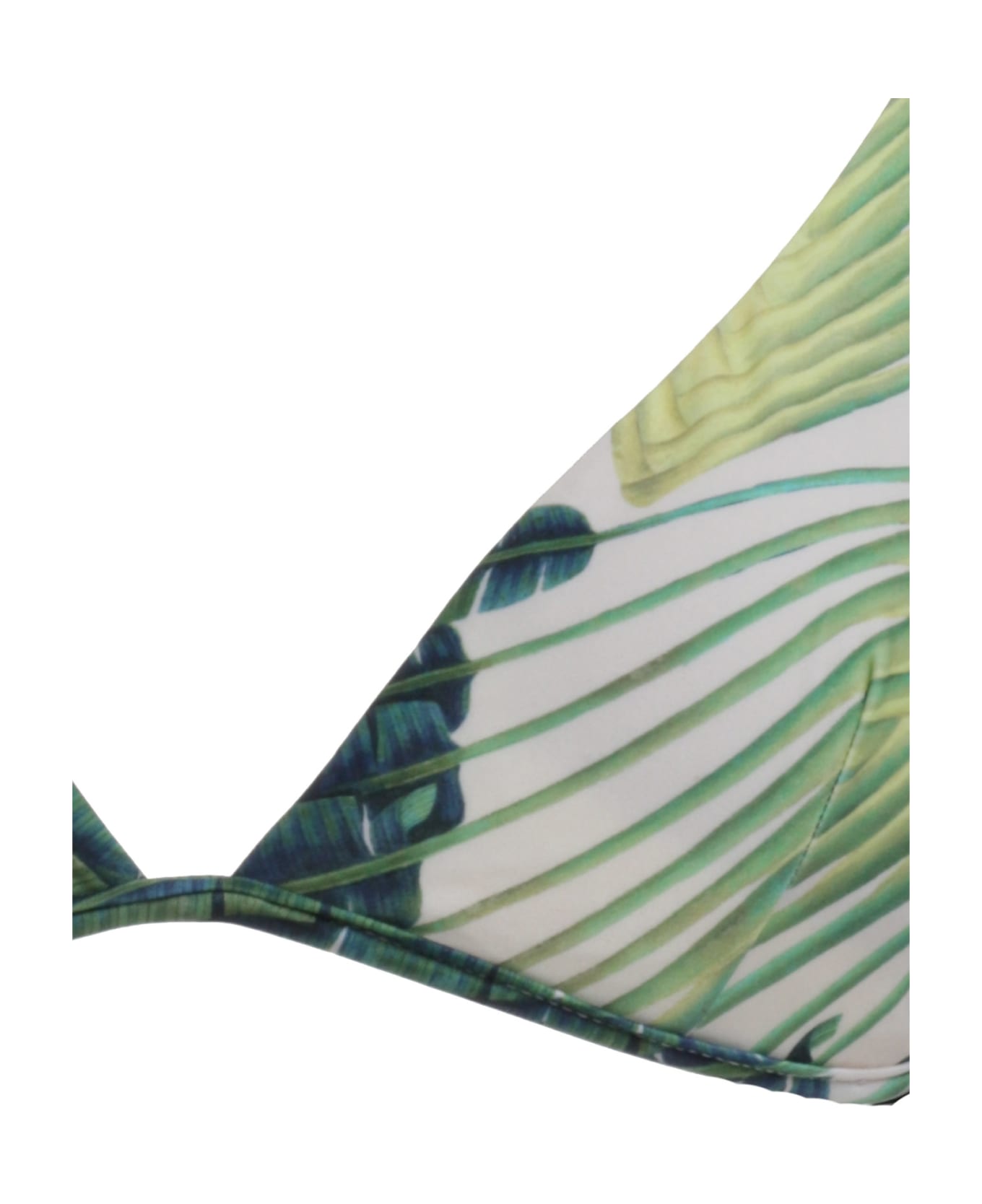 White triangle bikini top. Adjustable spaghetti straps and midriff ties. All over green palm print. 84% polyamide 36% elastane. Made in Italy. Designer colour: TROPICAL LEAVES