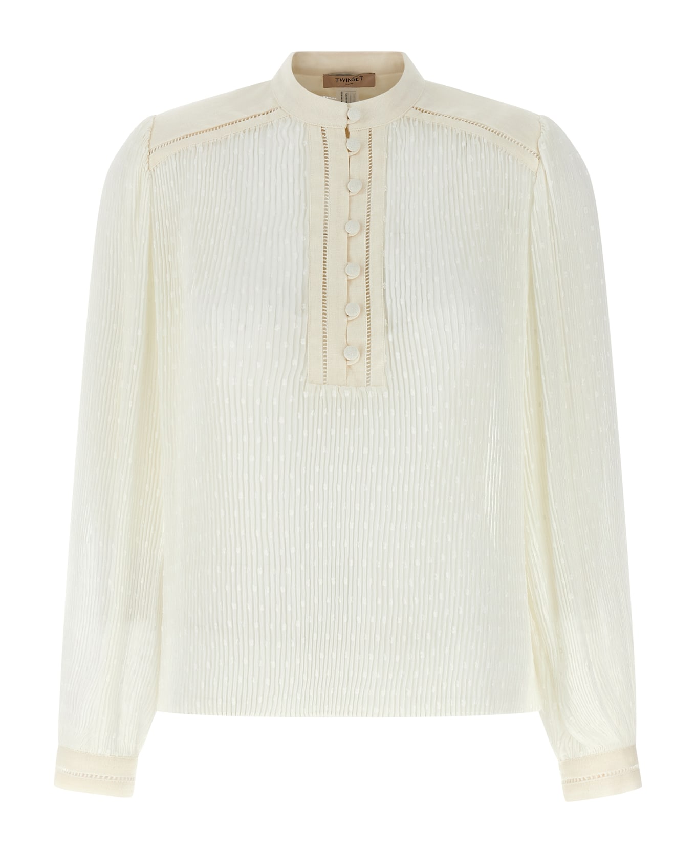 Pleated georgette blouse Fil coupé with polka dot design and linen details embroidered à jour in the same color, mandarin collar, metal Oval T logo on the back, button closure, long wide sleeves with cuffs, removable cotton muslin top.