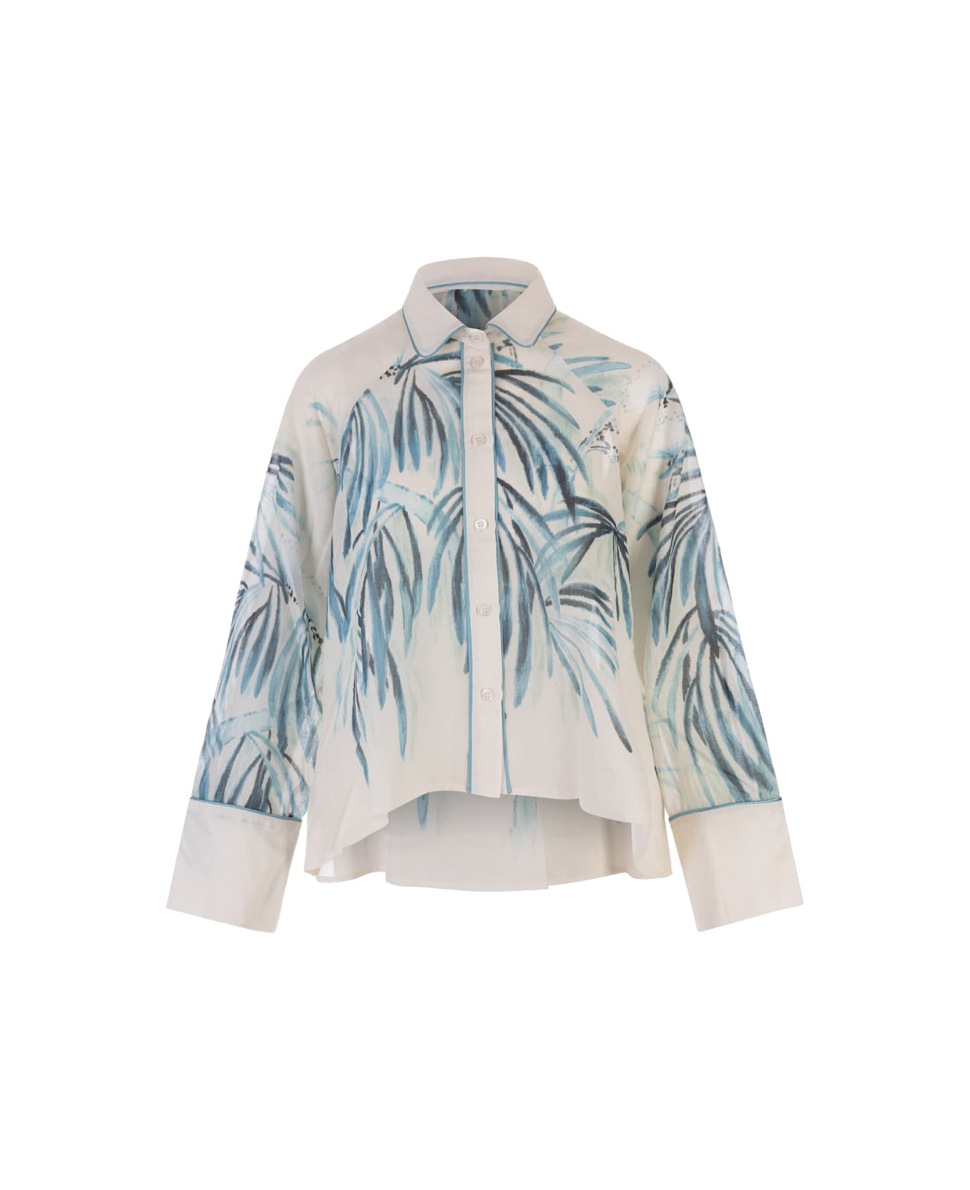 Arpinia A-line shirt by For Restless Sleepers in white cotton voile with all-over blue floral print. Slightly longer at the back with long raglan sleeves and high cuffs.