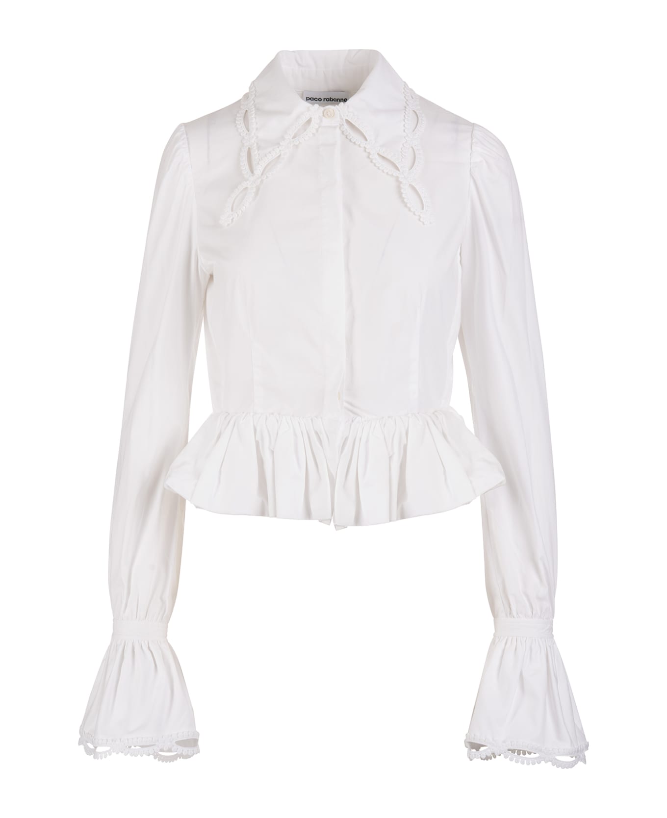 Women's peplum shirt by Paco Rabanne made of white cotton poplin and finished with matching embroidery on the collar and cuffs. Model featuring a slim fit, classic collar, long sleeves, corolla cuffs with button and front closure with covered buttons.