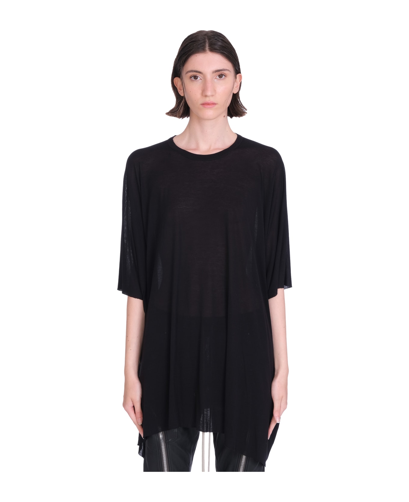 Minerva T-Shirt in black viscose, round neck, short sleeves, 88% viscose, 12% silk, Made in Italy, Model is 180 cm and wears 36