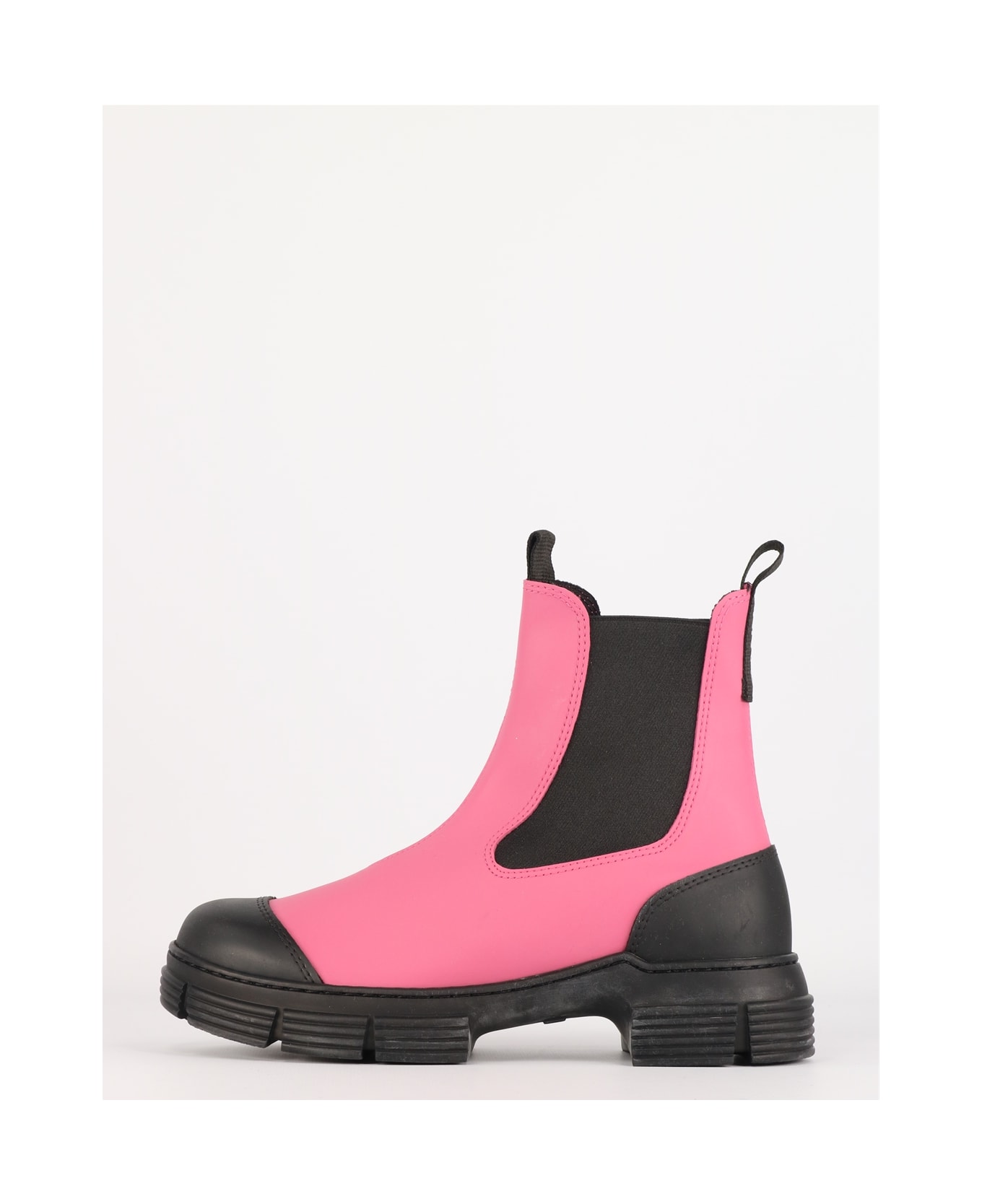 Ankle boots in recycled rubber with Chelsea-style stretch panels and front and back tab details. Round toe and thick ribbed rubber sole. Composition: 50% Recycled Rubber, 50% Rubber Material