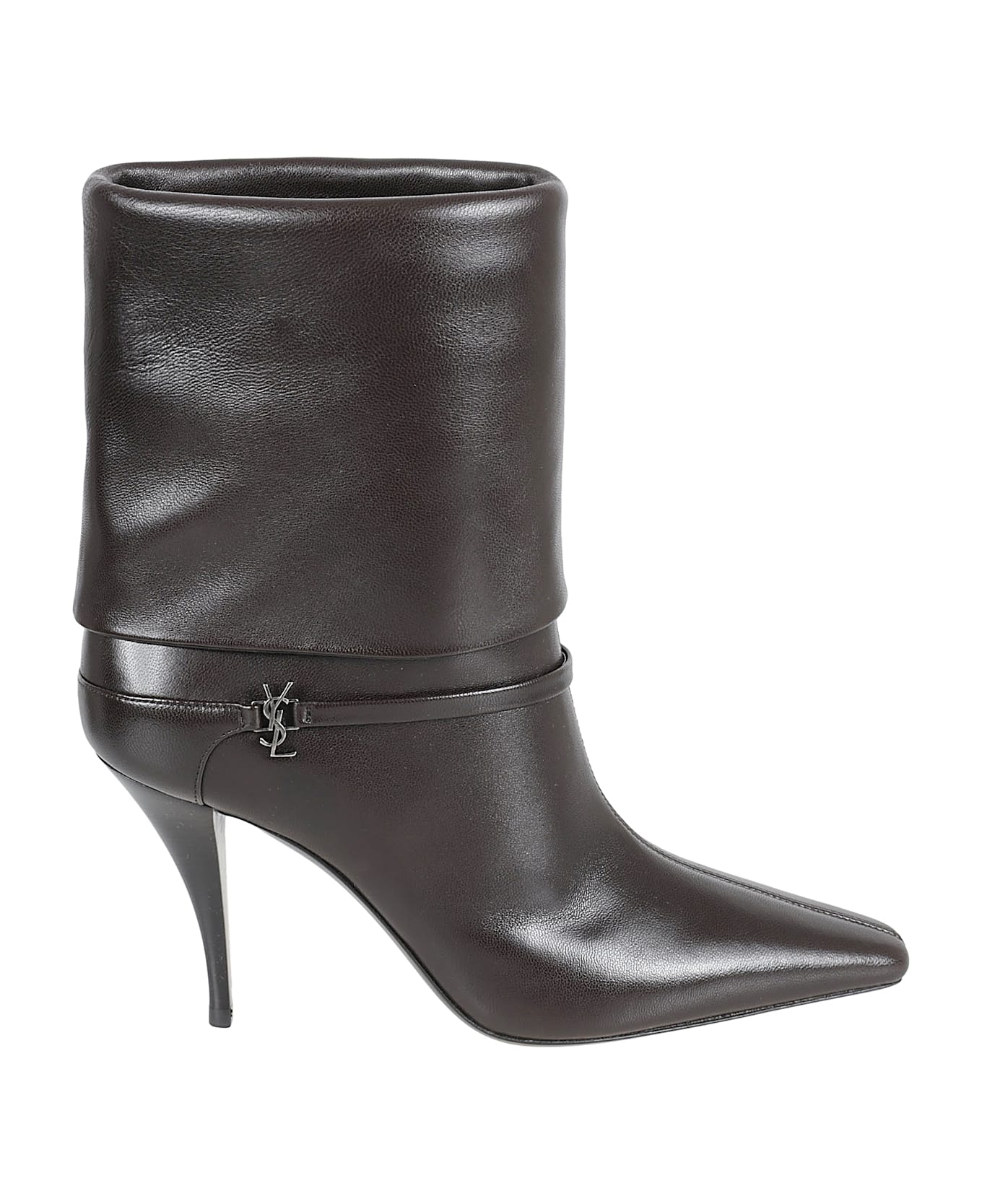 Lambskin vicky ankle boots by saint laurent featuring a slip-on style, an elongated toe, a three-dimensional iconic brand logo plaque applied to the side panel, and a leather stiletto heel.