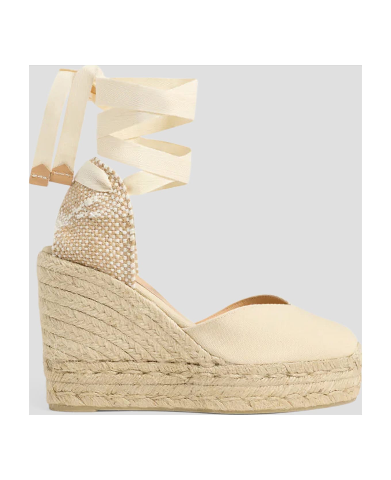 Castañer Chiara wedge platform espadrilles, in organic cotton and naturale jute. - SS24 - Height: 10 cm - Round toe - Front V- cut - Cut out detail on the back - Closure with laces to tie at the ankle - Jute midsole - Rubber sole - Made in Spain - Organic cotton