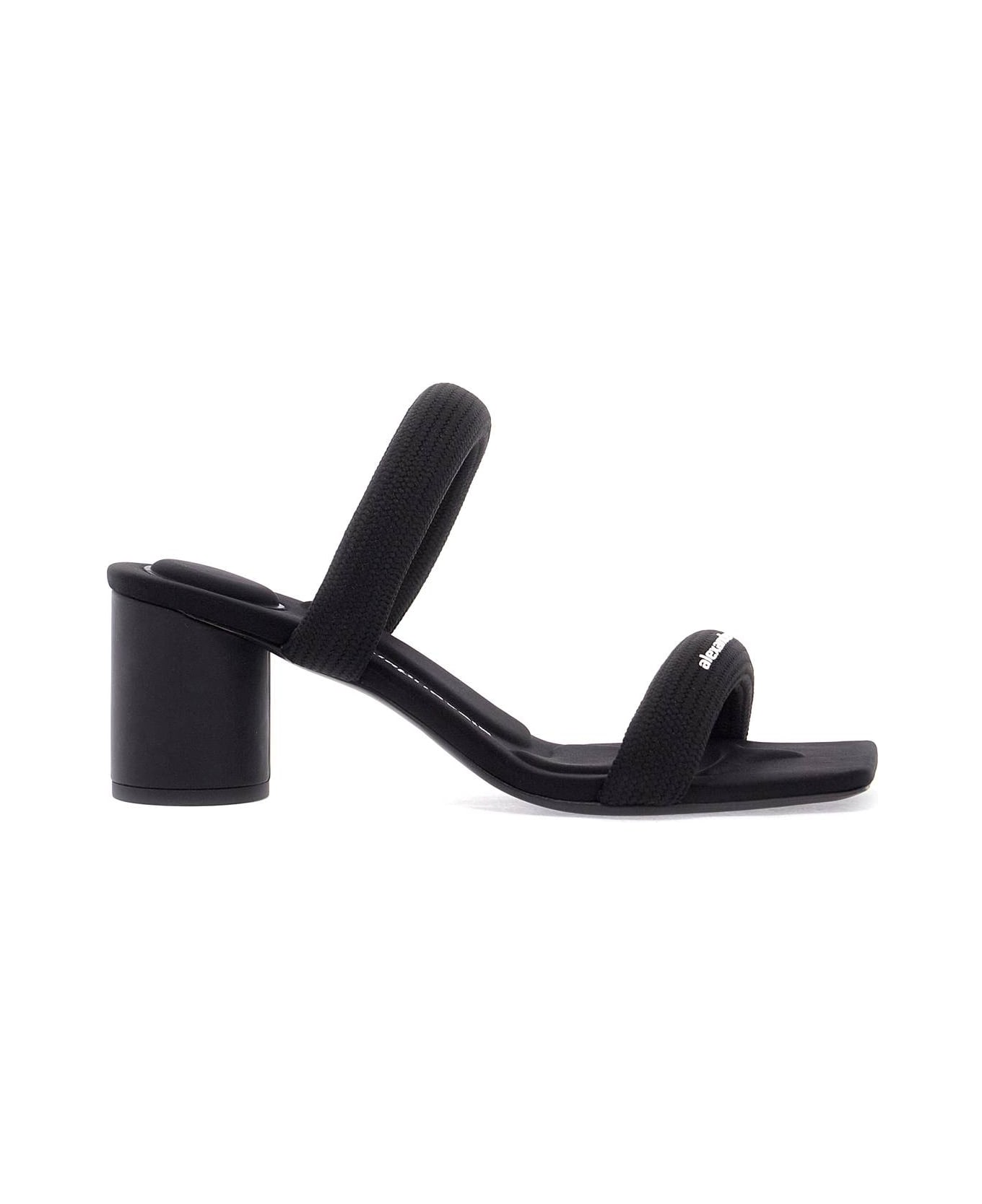 The Jax Mules by Alexander Wang feature padded nylon tubular straps, one of which is adorned with a contrasting logo lettering appliqué. They also have an anatomical insole, cylindrical heel, and rubber sole.