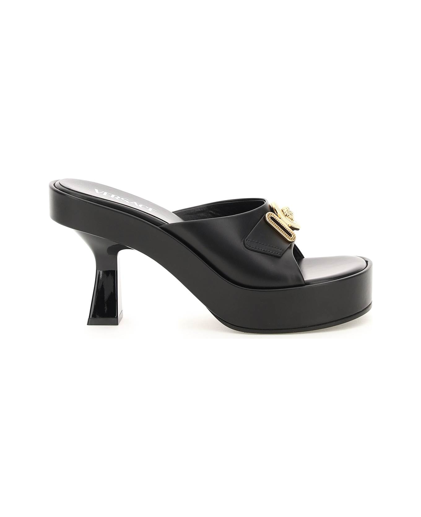 Versace leather mules with gold-finish Medusa Biggie applied on the band. Lacquer slightly flared heel. Leather footbed with contrasting lettering logo. Leather sole.