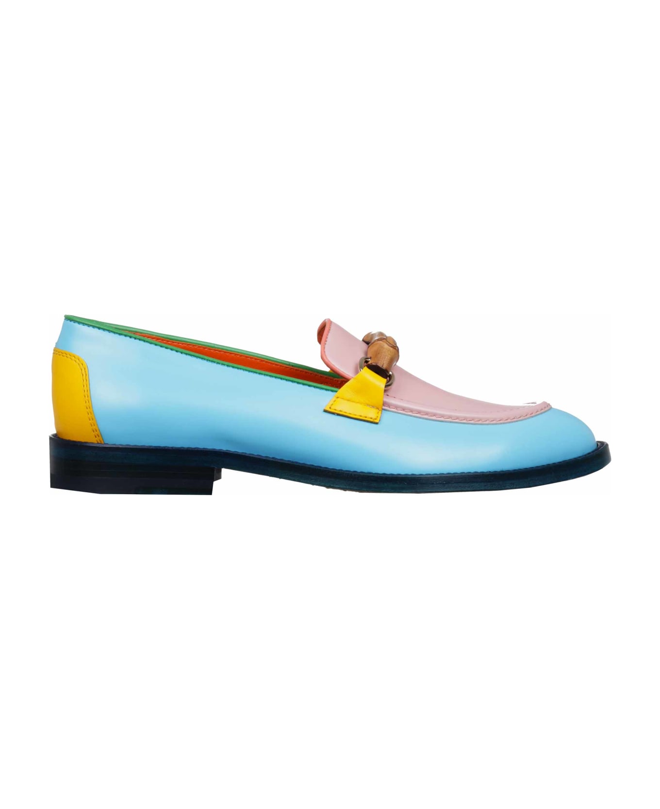 Multicoloured loafers in smooth leather. Colour-block design. Pin, green, blue and yellow. Green pining. Orange and aqua lining. Classic apron with bamboodetail. Dark blue sole. 2. 5 cm flat heel. 100% leather Made in Italy Designer colour: MULTI BLUE