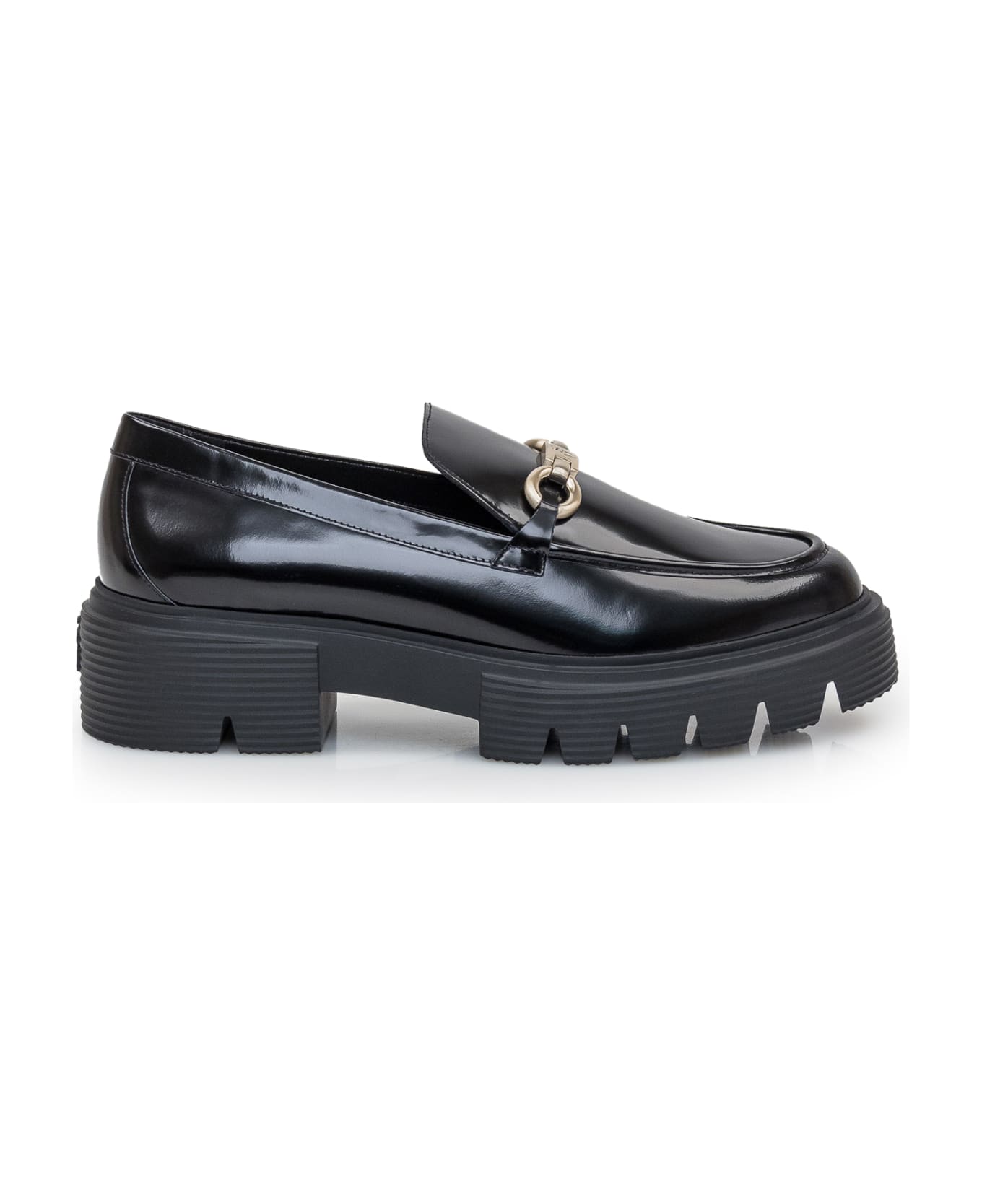 Black shiny leather loafer. Round toe. High block heel. Metal buckle with SW logo.