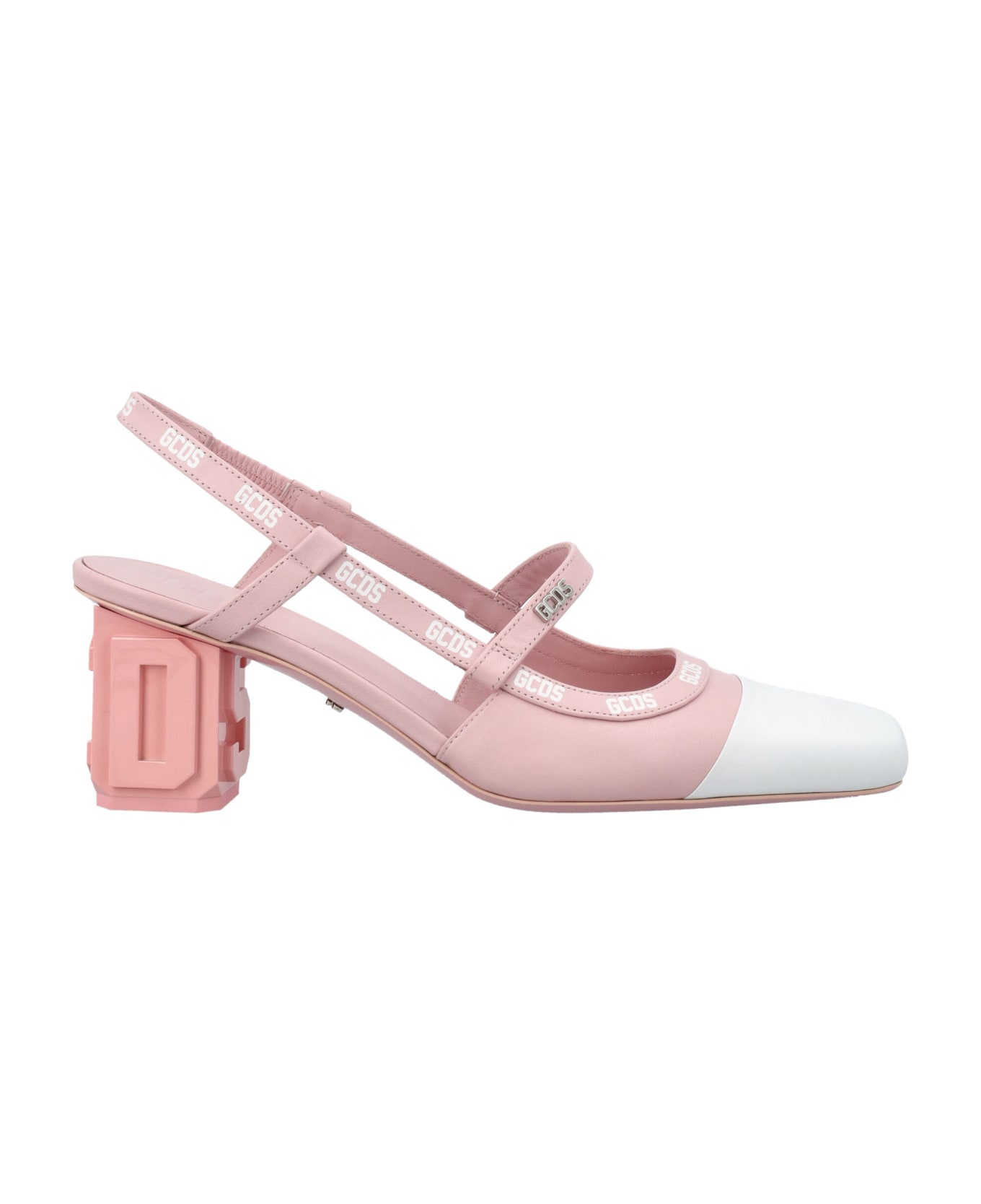 Pink Leather Lilit Slingback By Gcds. Featuring: - White Square Toe - Front Strap With Metal Logo Plaque - Elastic Logoed Slingback - Sculptured Block Heel With Embossed Logo