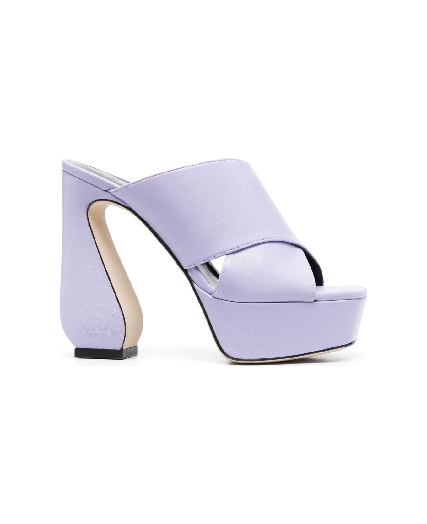 130mm platform leather mules from Si Rossi featuring lilac purple, calf leather, slip-on style, crossover strap detail, square toe, open toe, platform sole and high sculpted heel.