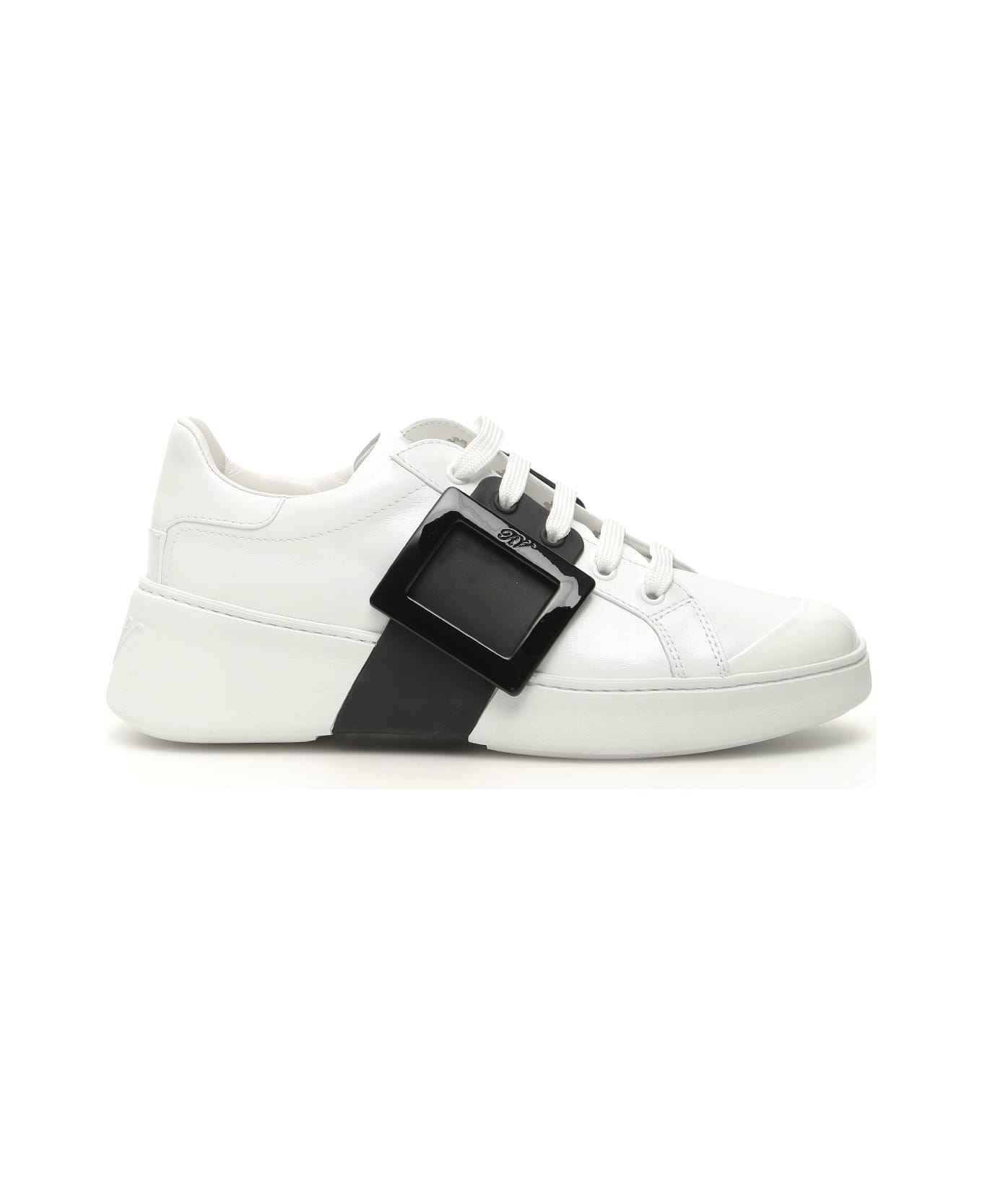 Roger Vivier leather sneakers with contrast rubber band and lacquered buckle. Patent-covered toe, polished metal eyelets, leather lining, removable insole, rubber sole with logo on the back. Extra laces included.