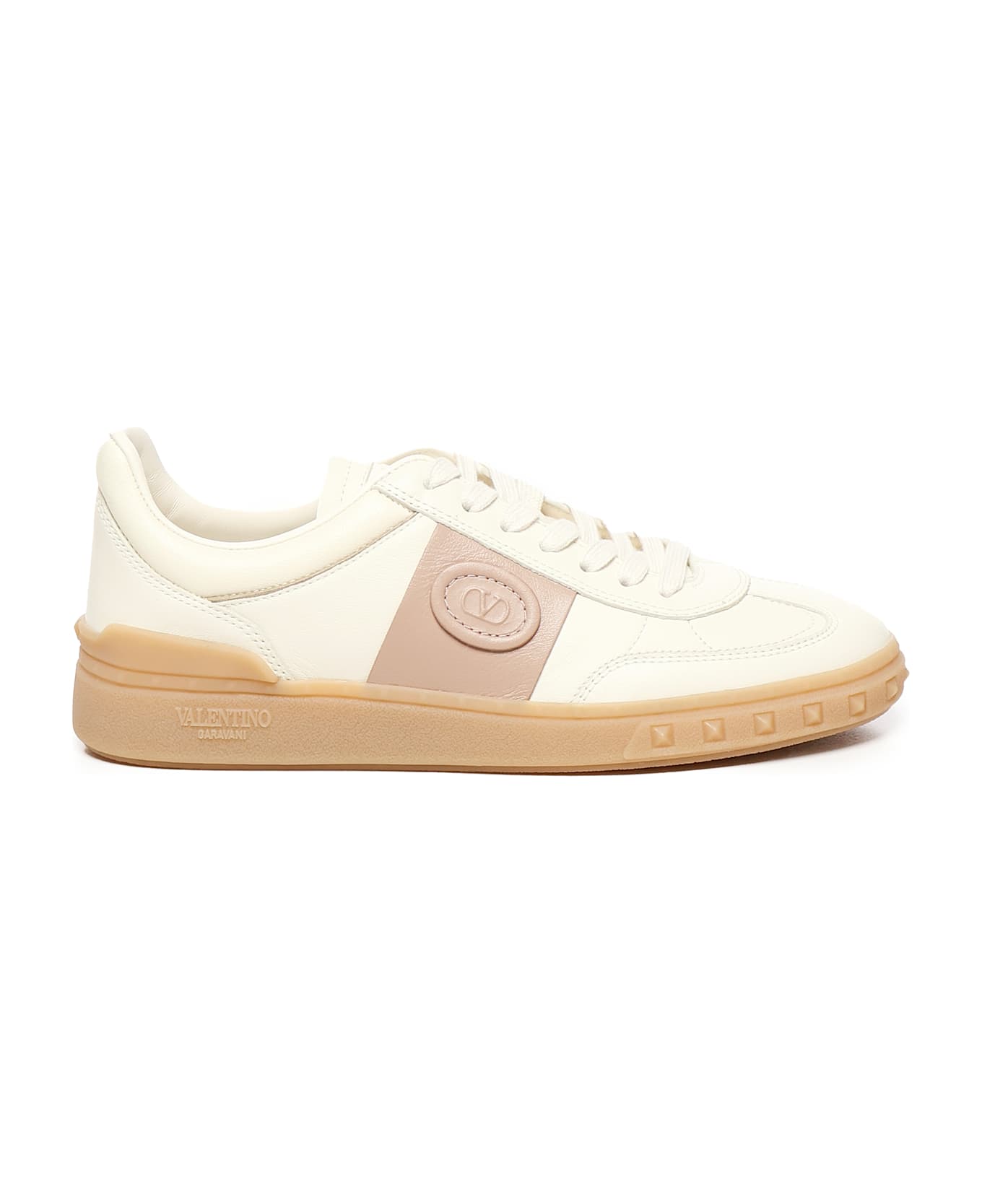 -Contrasting side band -Logo details -Laminated nappa profiles -Customized rubber sole with stud detail -Made in Italy -Color: Ivory, Pink