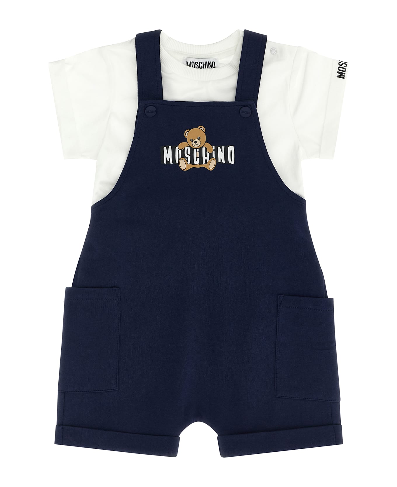 Set consisting of cotton jersey t-shirt, crew neck, snap buttons on the left shoulder, short sleeves with turn-up on the cuffs and Logo lettering print and gauze cotton dungarees with front 'Moschino Teddy Bear' print, braces with snap buttons, elastic waistband at the back, pockets, turn-up on the hem.