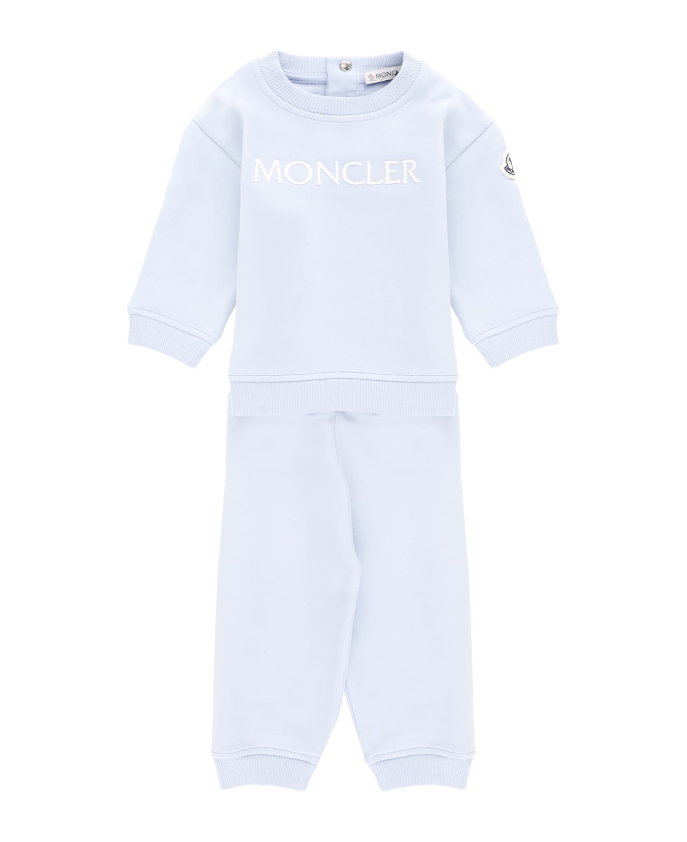 - Light blue Moncler Baby two pieces jumpsuit for boy - Round neck with button - Long sleeves - Contrasting color iconic logoed patch at left sleeve - Front contrasting color embroidered logo - Pants with elastic waist