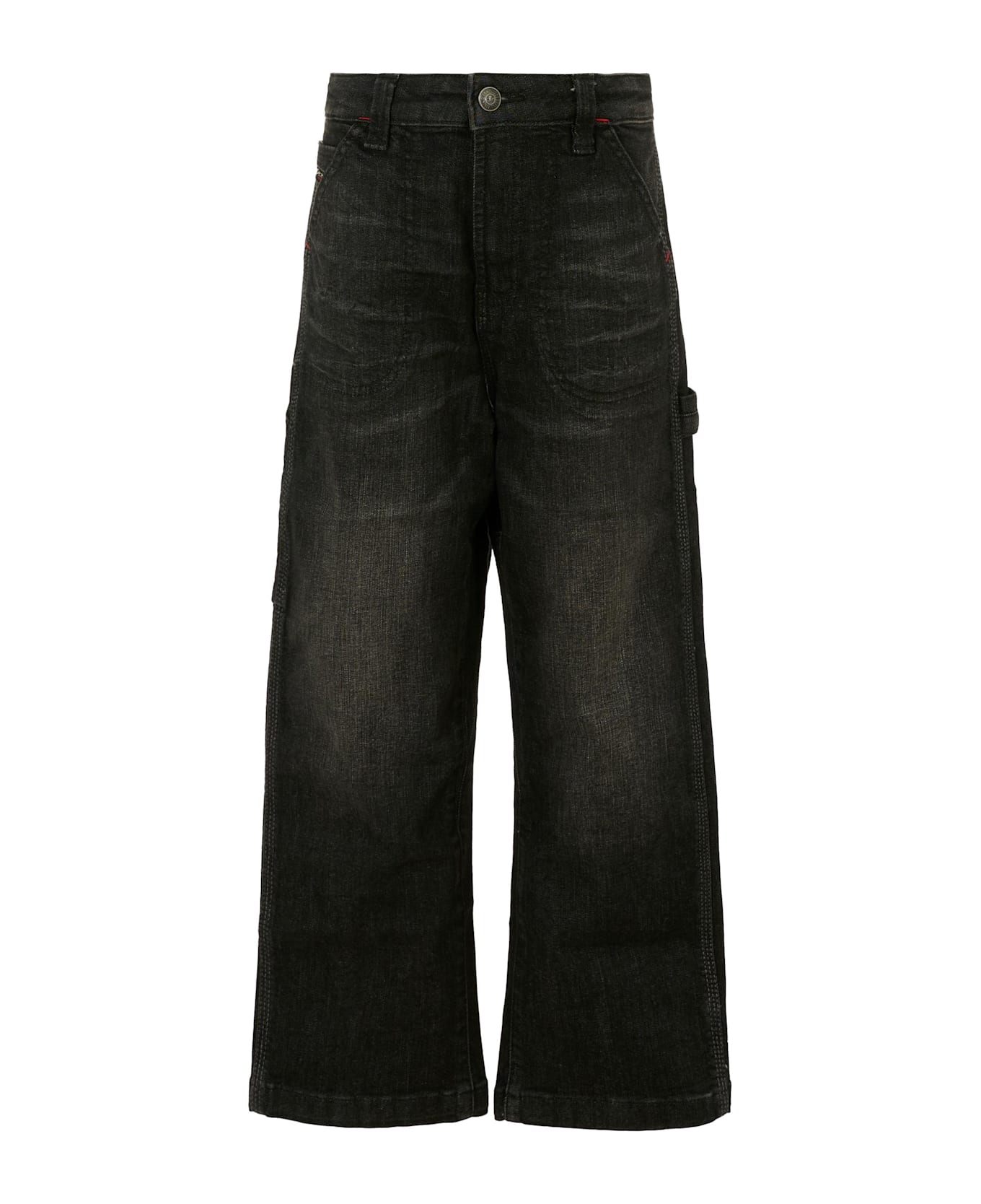 Black five-pocket jeans, with belt loops, front zip and button fastening; the waist is adjustable thanks to an internal elastic with buttons. They are embellished with a logo patch, on the front and on the back pocket.